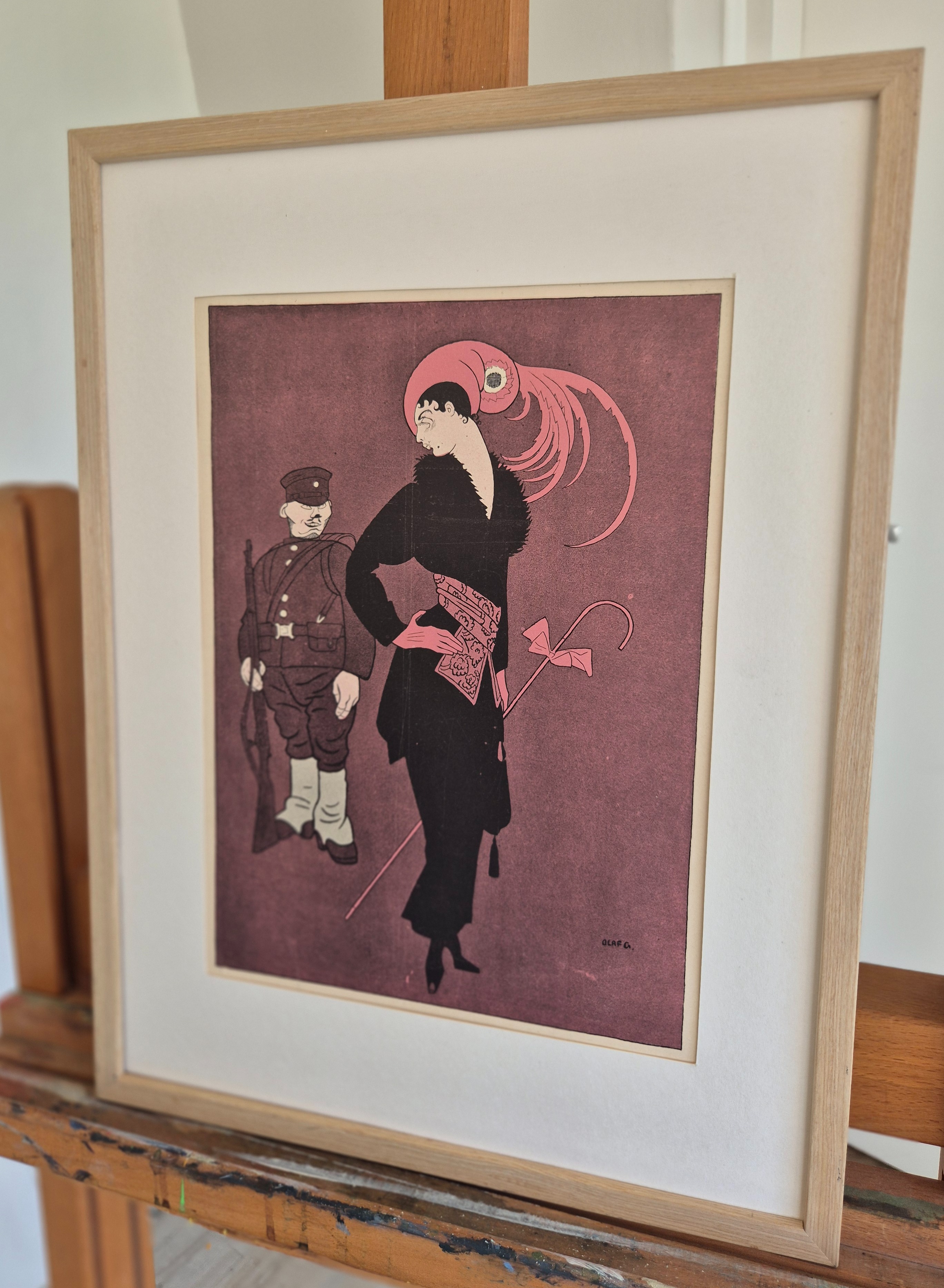 Wat kijk je nou. Bijzondere authentieke prent. Mooie inkijk in de mode en lifestyle van begin jaren 20e eeuw. Komt uit Duits weekblad Simplicissimus, waar elke week een mode, lifestyle of licht erotische prent werd afgedrukt. De prent wordt geleverd in passe partout in het formaat 30x40. Deze prent is gedrukt midden in de Jugendstil periode in 1914. Prent gemaakt door Olaf Gulbransson in weekblad Simplicissimus.