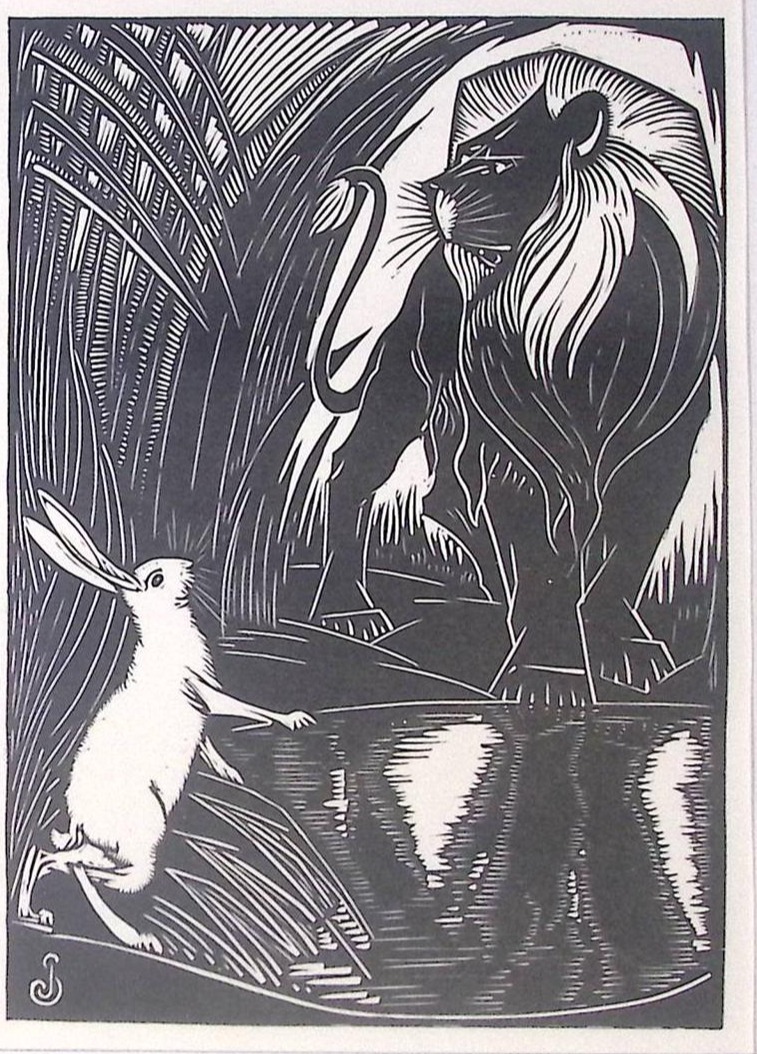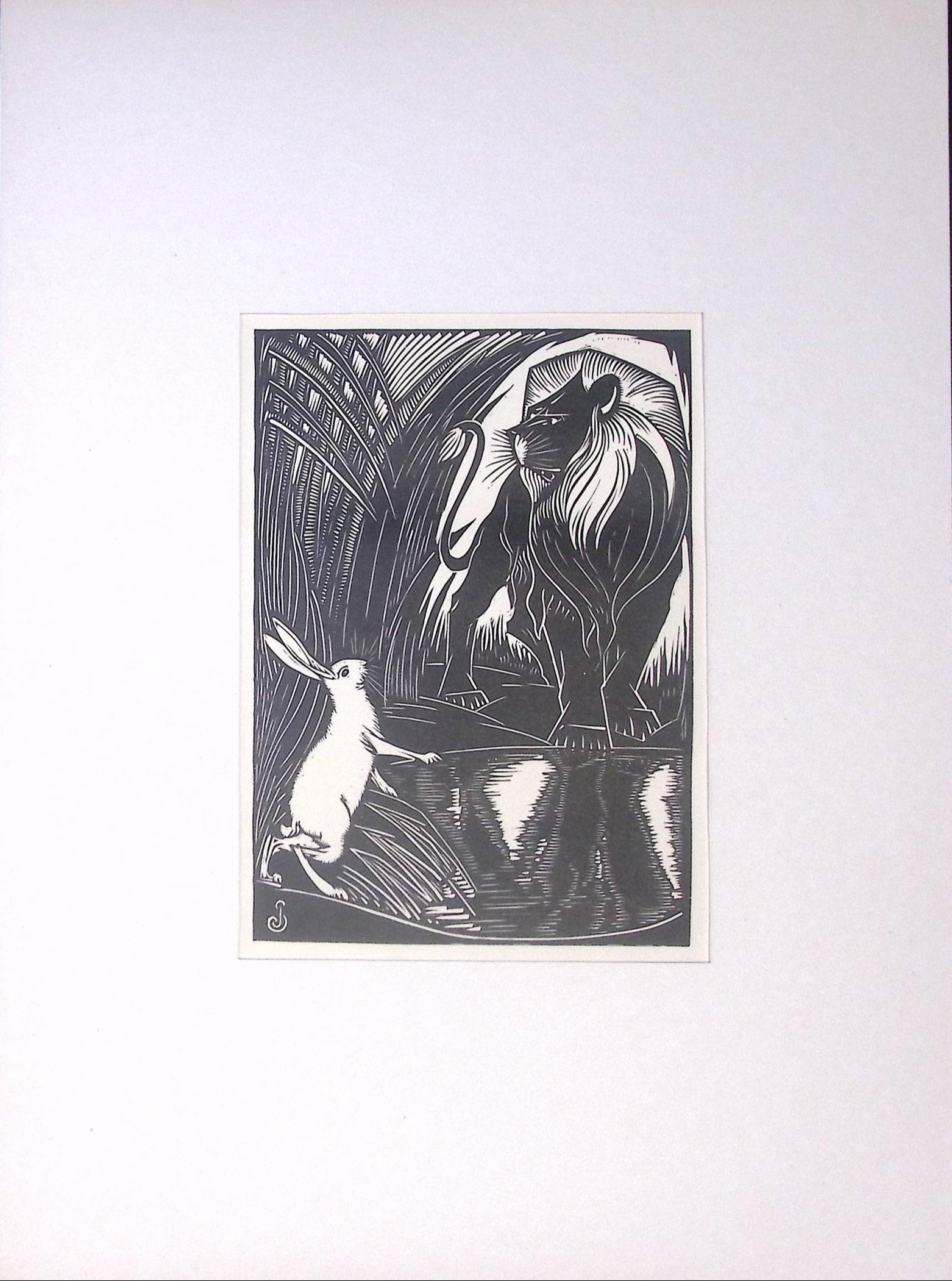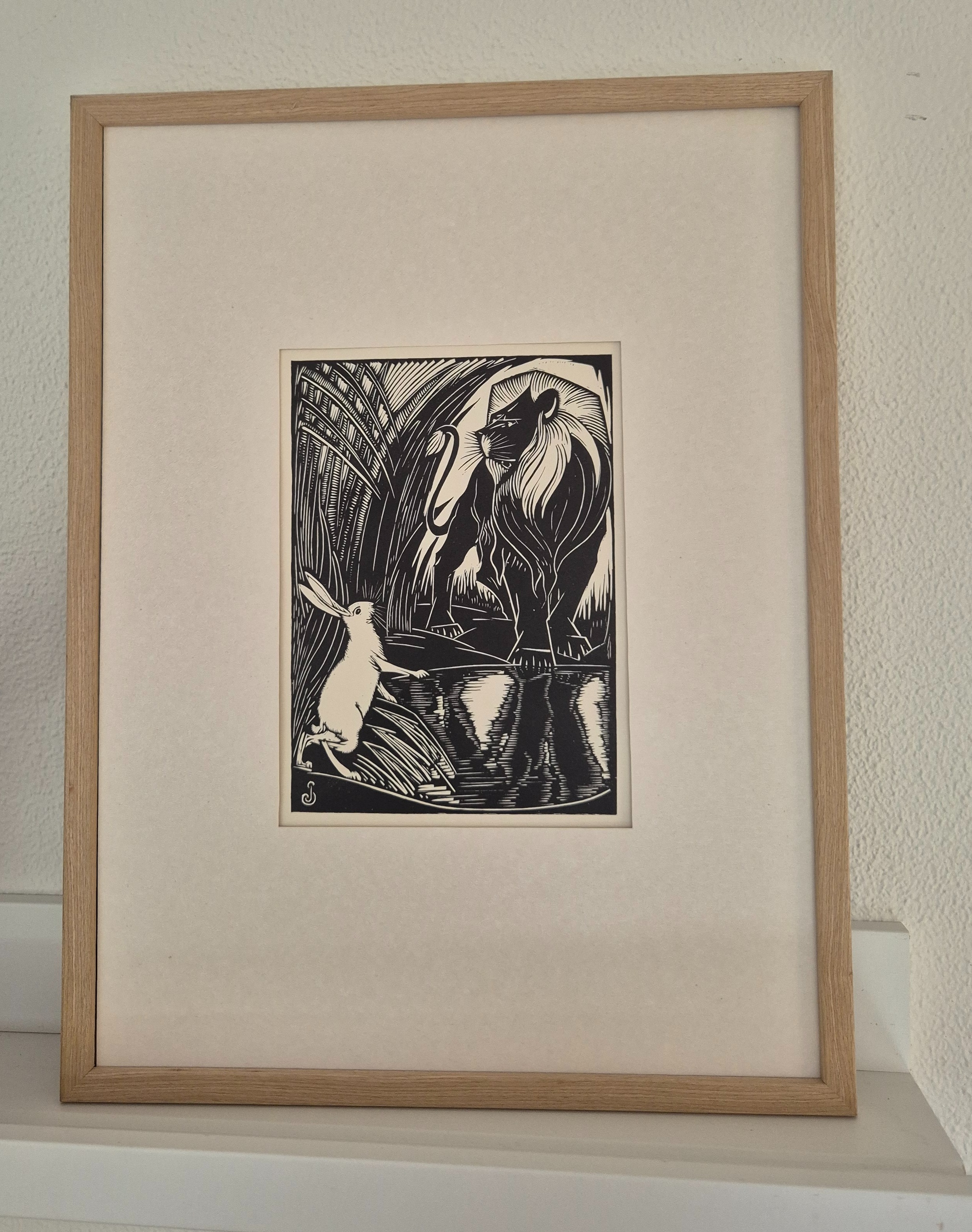 Bijzondere authentieke prent (houtsnede), geen herdruk! Komt uit het boek Misleidende Majesteit, waar dierenprenten in een verhaal verwerkt zijn Gemaakt door de bekende Nederlandse kunstenaar Jan Schonk. Wordt geleverd in passe partout in formaat 30x40.