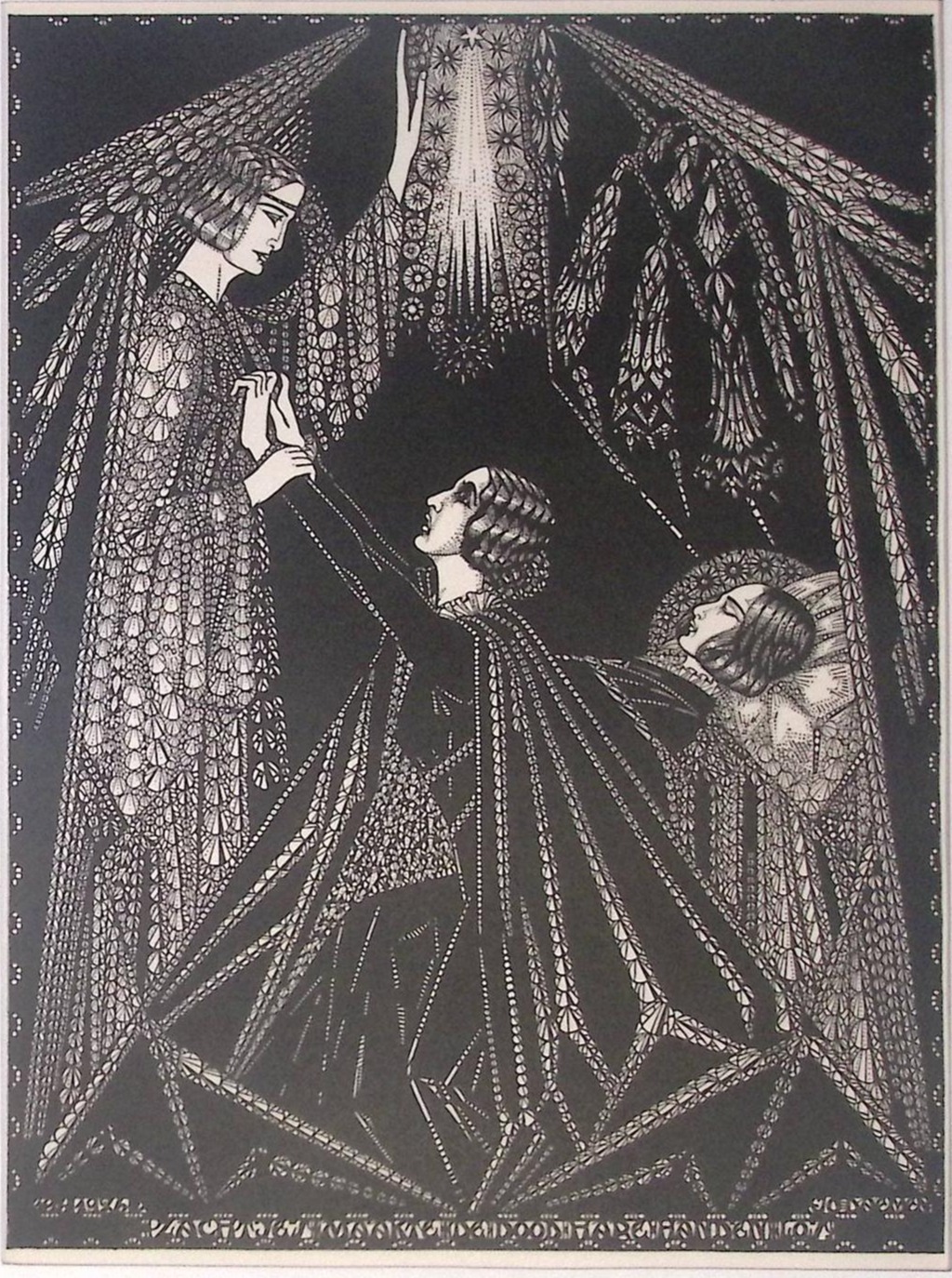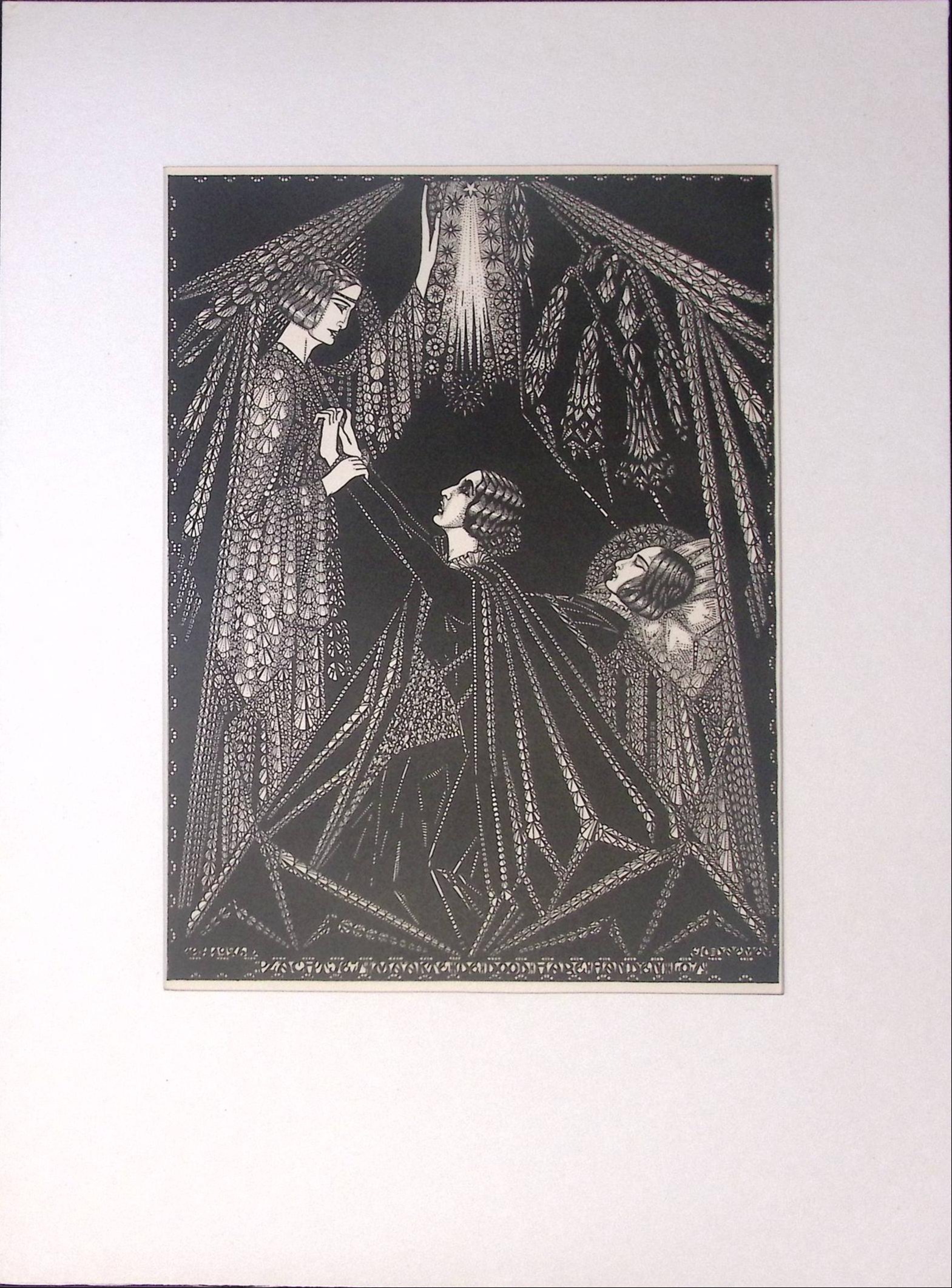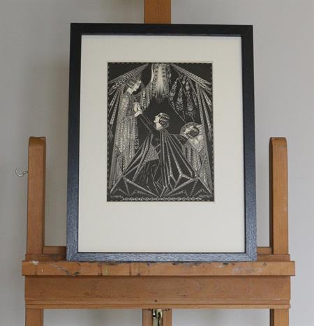 Bijzondere authentieke prent (houtsnede), geen herdruk! Komt uit het boek De heilige vlam, waar prachtige prenten in een verhaal verwerkt zijn Gemaakt door de bekende Nederlandse kunstenares Jo Daemen. Wordt geleverd in passe partout in formaat 30x40.