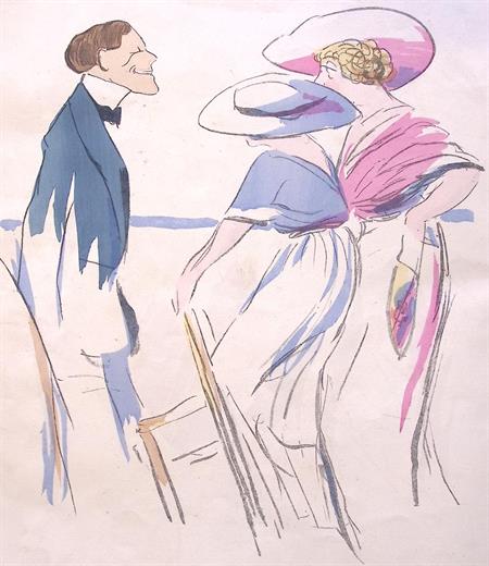Deze prachtige litho toont het mondaine leven aan de kust van Biarritz, met elegante figuren en krakturale accenten. Ze combineren humor en decoratieve esthetiek uit Belle Epoque-tijdperk. De litho komt uit het boek "Biarritz", gemaakt door Jean Joubert.