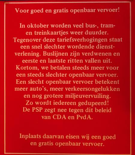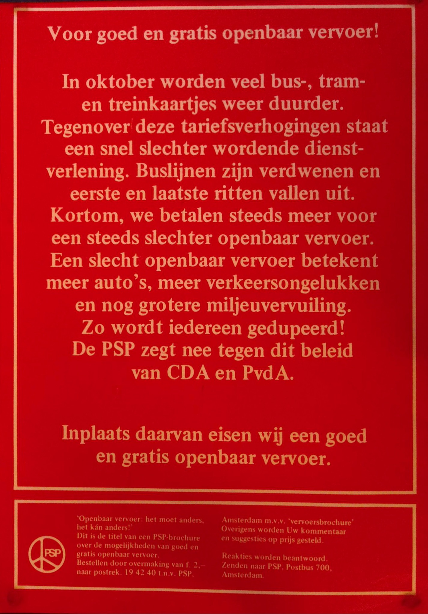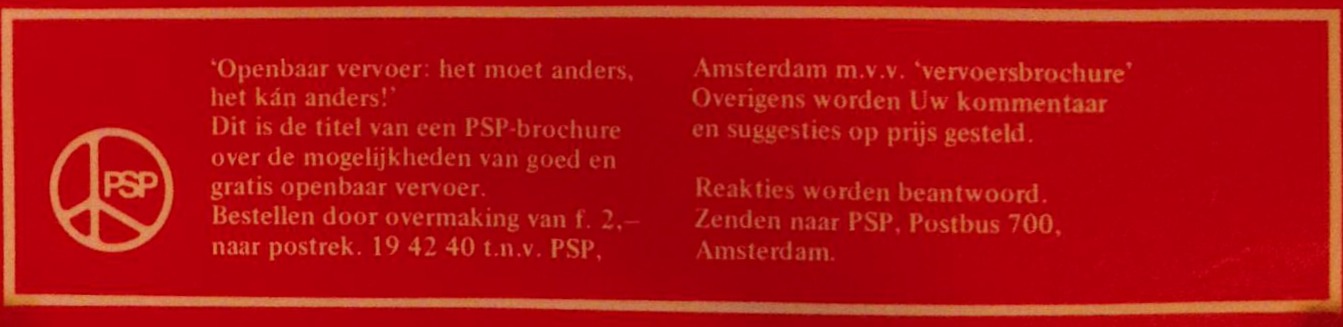 Voor goed en gratis openbaar vervoer! In oktober worden veel bus-, tram- en treinkaartjes weer duurder. Tegenover deze tariefsverhogingen staat een snel slechter wordende dienst- verlening. Buslijnen zijn verdwenen en eerste en laatste ritten vallen uit. Kortom, we betalen steeds meer voor een steeds slechter openbaar vervoer. Een slecht openbaar vervoer betekent meer auto's, meer verkeersongelukken en nog grotere miljeuvervuiling. Zo wordt iedereen gedupeerd! De PSP zegt nee tegen dit beleid van CDA en PvdA. Inplaats daarvan eisen wij een goed en gratis openbaar vervoer. PSP Openbaar vervoer het moet anders. het kan ander!" Dit is de titel van een PSP-brochure over de mogelijkheden van goed en gratis openbaar vervoer Bestellen door overmaking van f. 2,- naar postrek. 19 42 40 tnv PSP, Amsterdam m.v.v. 'vervoersbrochure Overigens worden Uw kommentaar en suggesties op prijs gesteld Reakties worden beantwoord. Zenden naar PSP, Postbus 700. Amsterdam.