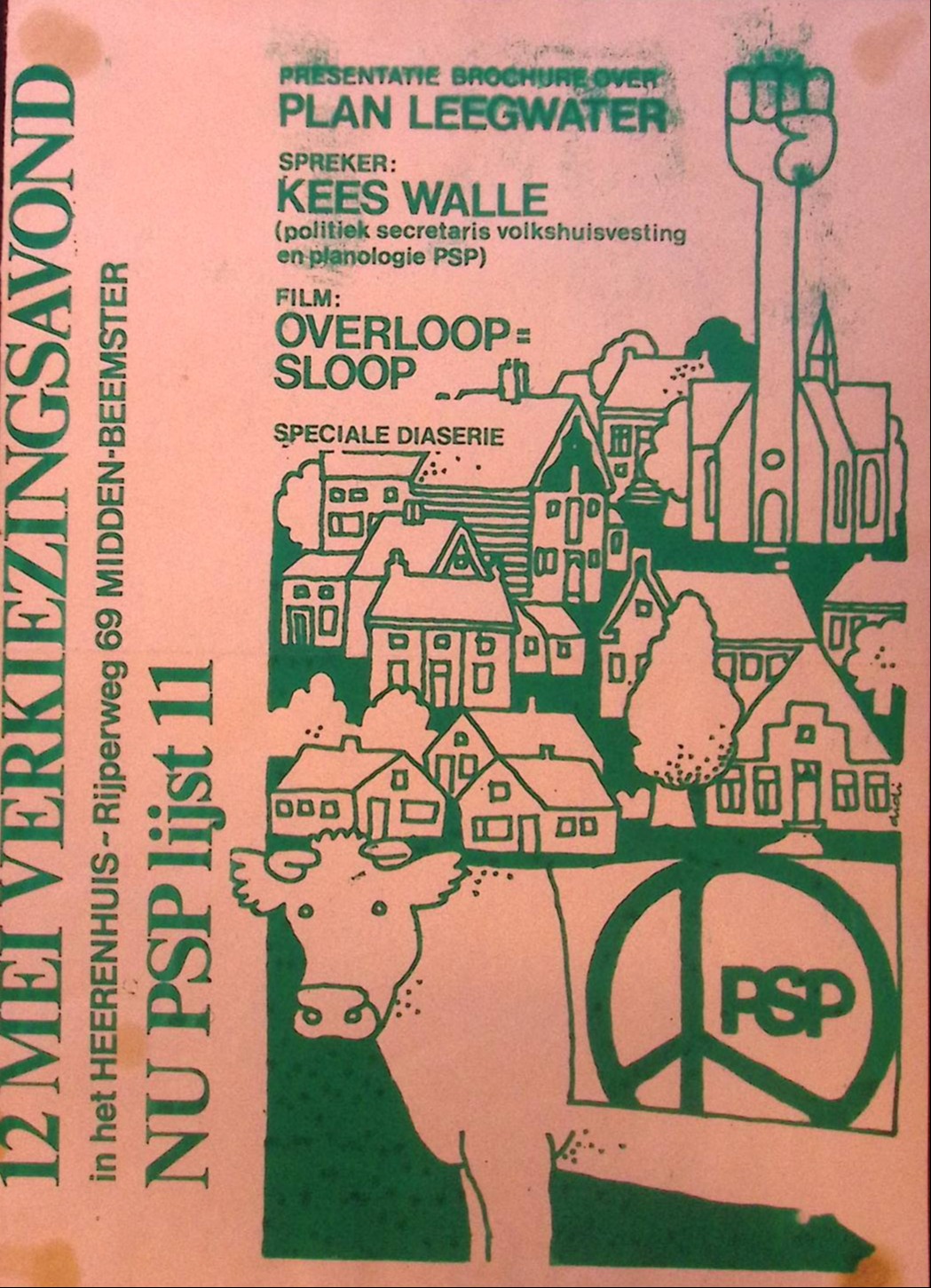 PRESENTATIE BROCHURE OVER PLAN LEEGWATER SPREKER: KEES WALLE (politiek secretaris volkshuisvesting en planologie PSP) FILM: OVERLOOP= SLOOP SPECIALE DIASERIE 12 MEI VERKIEZINGSAVOND in het HEERENHUIS-Rijperweg 69 MIDDEN-BEEMSTER NU PSP lijst 11 PSP.