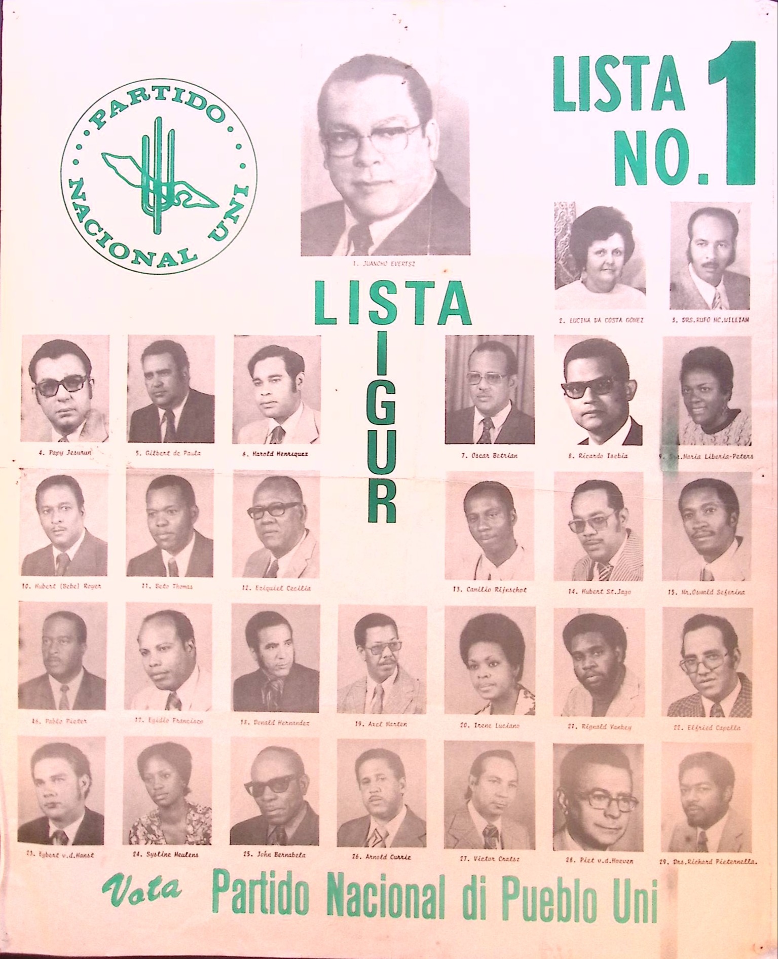 partido national uni partido nacional di pueblo uni. De afmeting van deze prent is ca. 43 bij 53 centimeter.