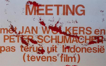 Deze poster bevat de volgende tekst: VRIJDAG 13 OKT. 20.00 UUR IN FRASCATI, NES 59-63 MEETING met JAN WOLKERS en PETER SCHUMACHER pas terug uit Indonesië (tevens film) STOP DE NEDERLANDSE STEUN AAN DE ONDERDRUKKING IN INDONESIE org:Indonesië-komité, ASVA/SRVU toegang fl.1.50. De prent heeft een afmeting van ca. 42 bij 60 centimeter.