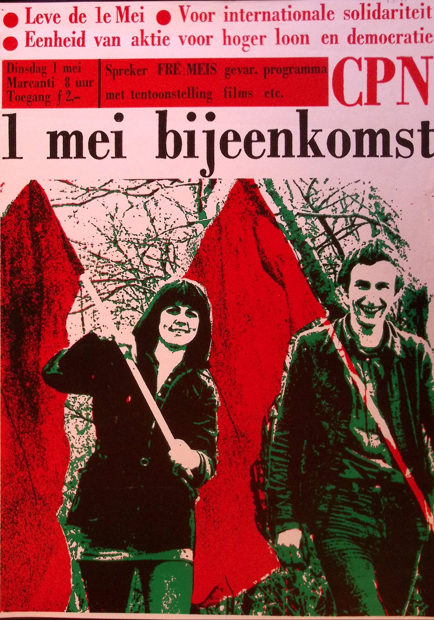 Leve de le Mei Voor internationale solidariteit Eenheid van aktie voor hoger loon en democratie Dinsdag 1 mei Marcanti 8 uur Toegang f2,- Spreker FRE:MEIS gevar. programma met tentoonstelling films etc. CPN 1 mei bijeenkomst.