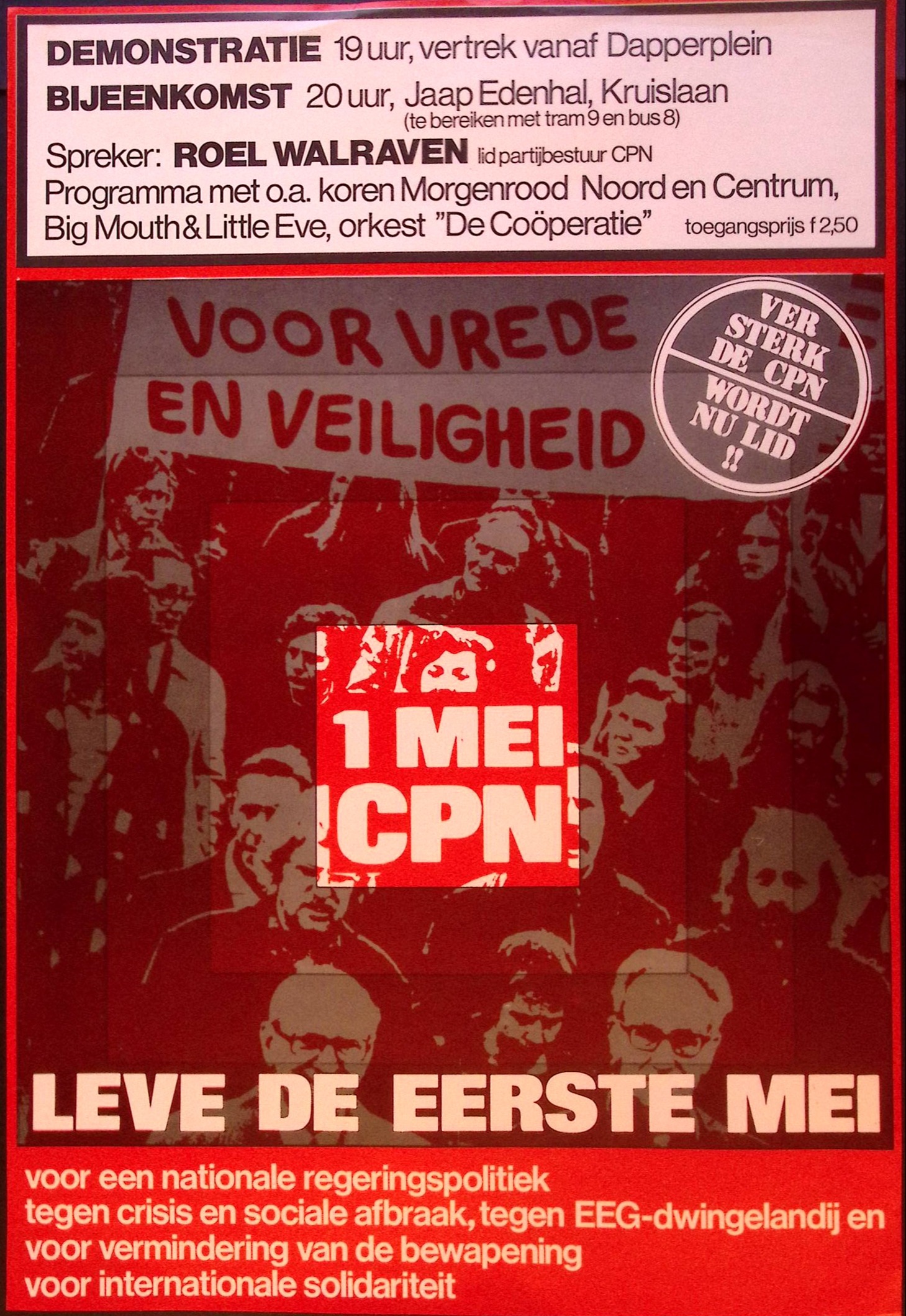 DEMONSTRATIE 19 uur, vertrek vanaf Dapperplein BIJEENKOMST 20 uur, Jaap Edenhal, Kruislaan (te bereiken met tram 9 en bus 8) Spreker: ROEL WALRAVEN idpartijbestuur CPN Programma met o.a. koren Morgenrood Noord en Centrum, Big Mouth & Little Eve, orkest "De Coöperatie" toegangsprijs f 2,50,- VOOR VREDE EN VEILIGHEID VERSTERK DE CPN WORDT NU LID 1 MEI CPN LEVE DE EERSTE MEI voor een nationale regeringspolitiek tegen crisis en sociale afbraak, tegen EEG-dwingelandij en voor vermindering van de bewapening voor internationale solidariteit.
