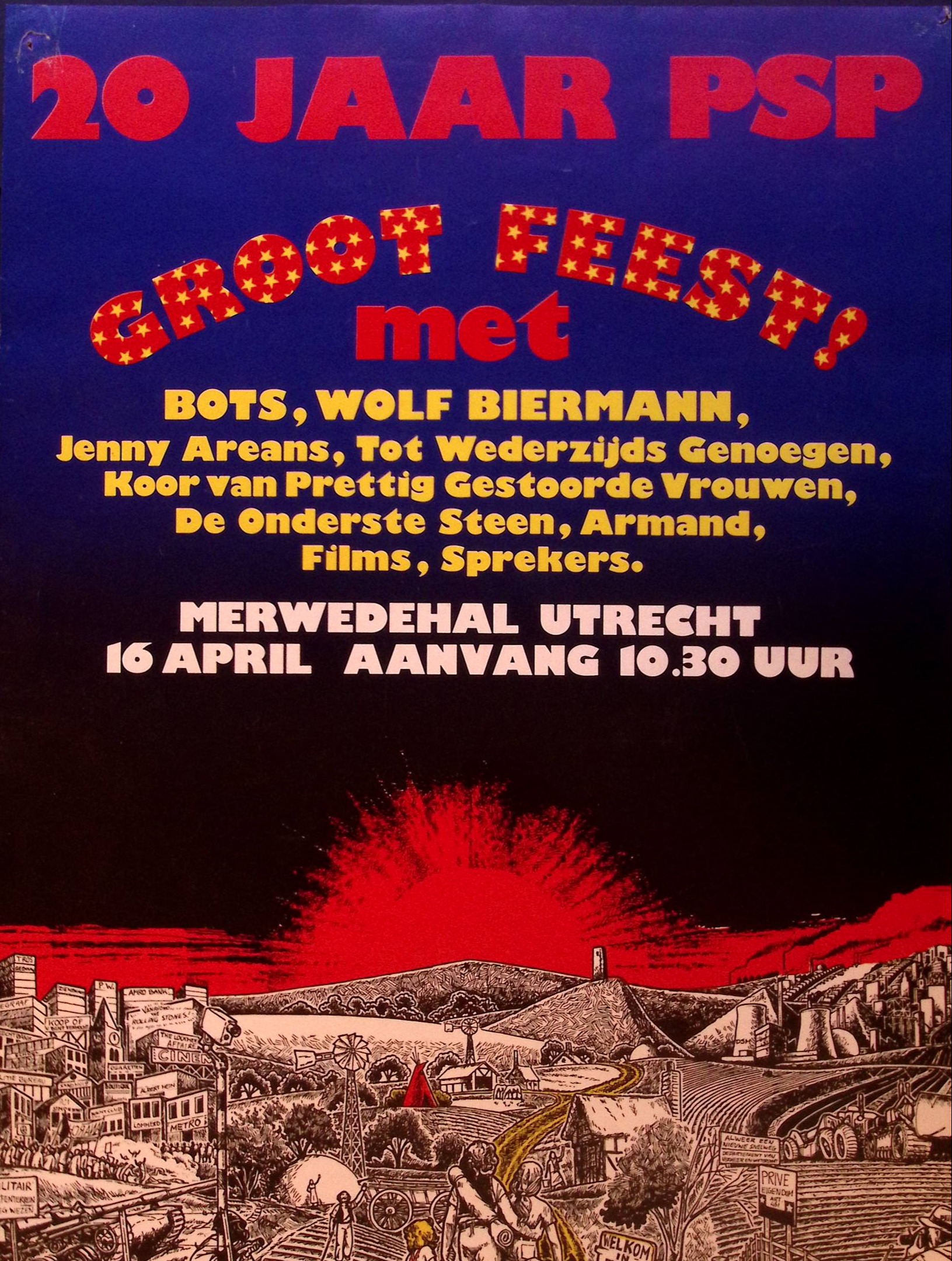20 JAAR PSP groot feest! met BOTS, WOLF BIERMANN, Jenny Areans, Tot Wederzijds Genoegen, Koor van Prettig Gestoorde Vrouwen, De Onderste Steen, Armand, Films, Sprekers. MERWEDEHAL UTRECHT 16 APRIL AANVANG 10.30 UUR.