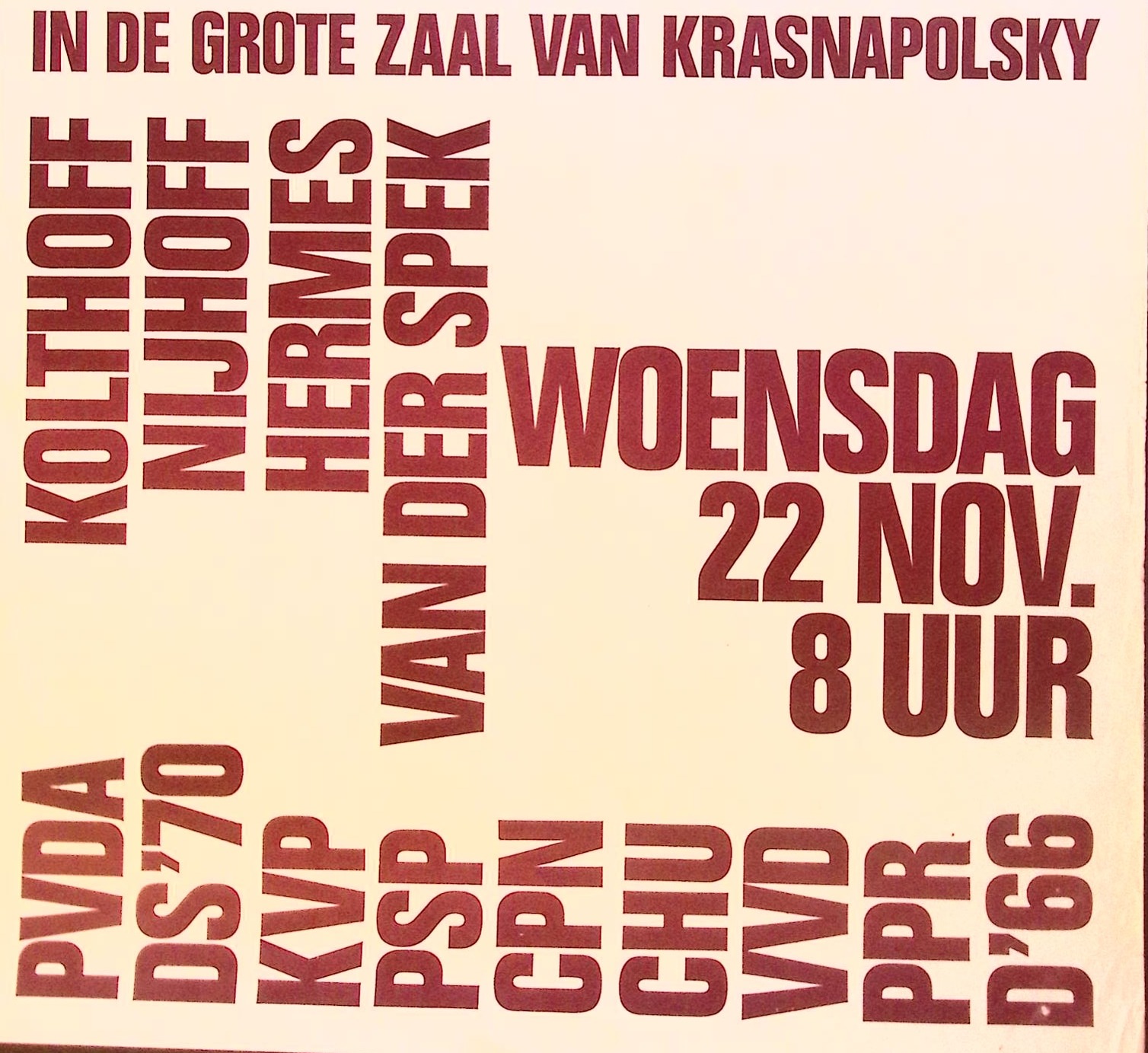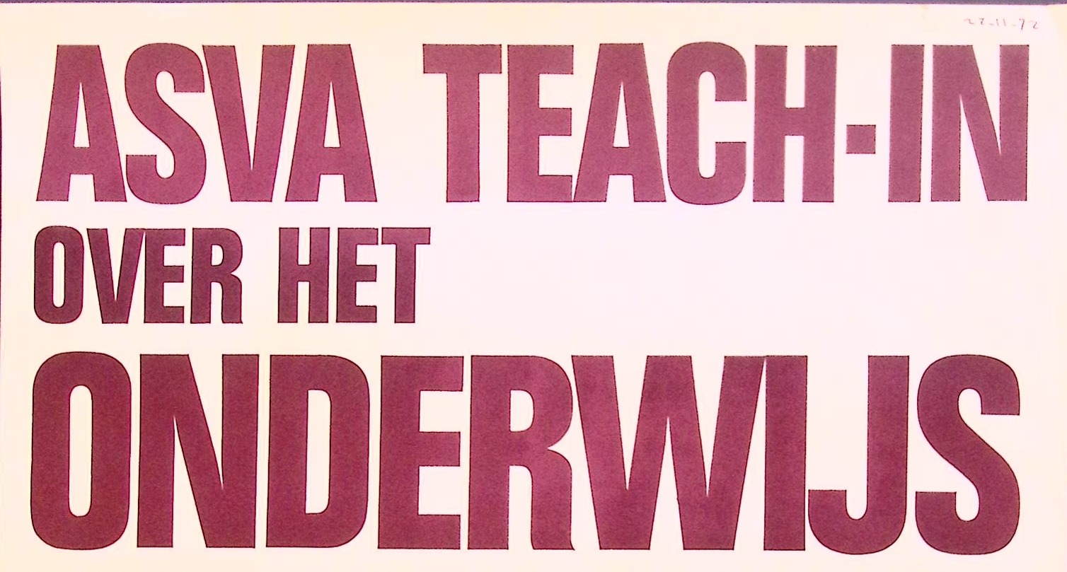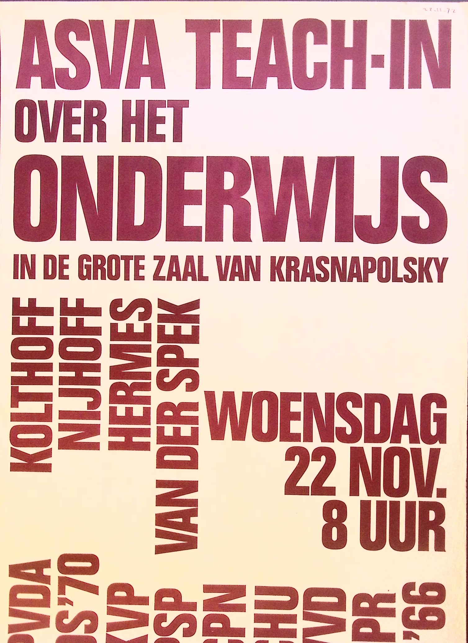 Asva teach-in over het onderwijs in de grote zaal van krasnapolsky, kolthoff, nijhoff, hermes, van der spek woensdag 22 nov. 8 uur.
