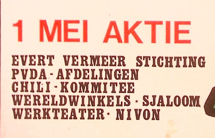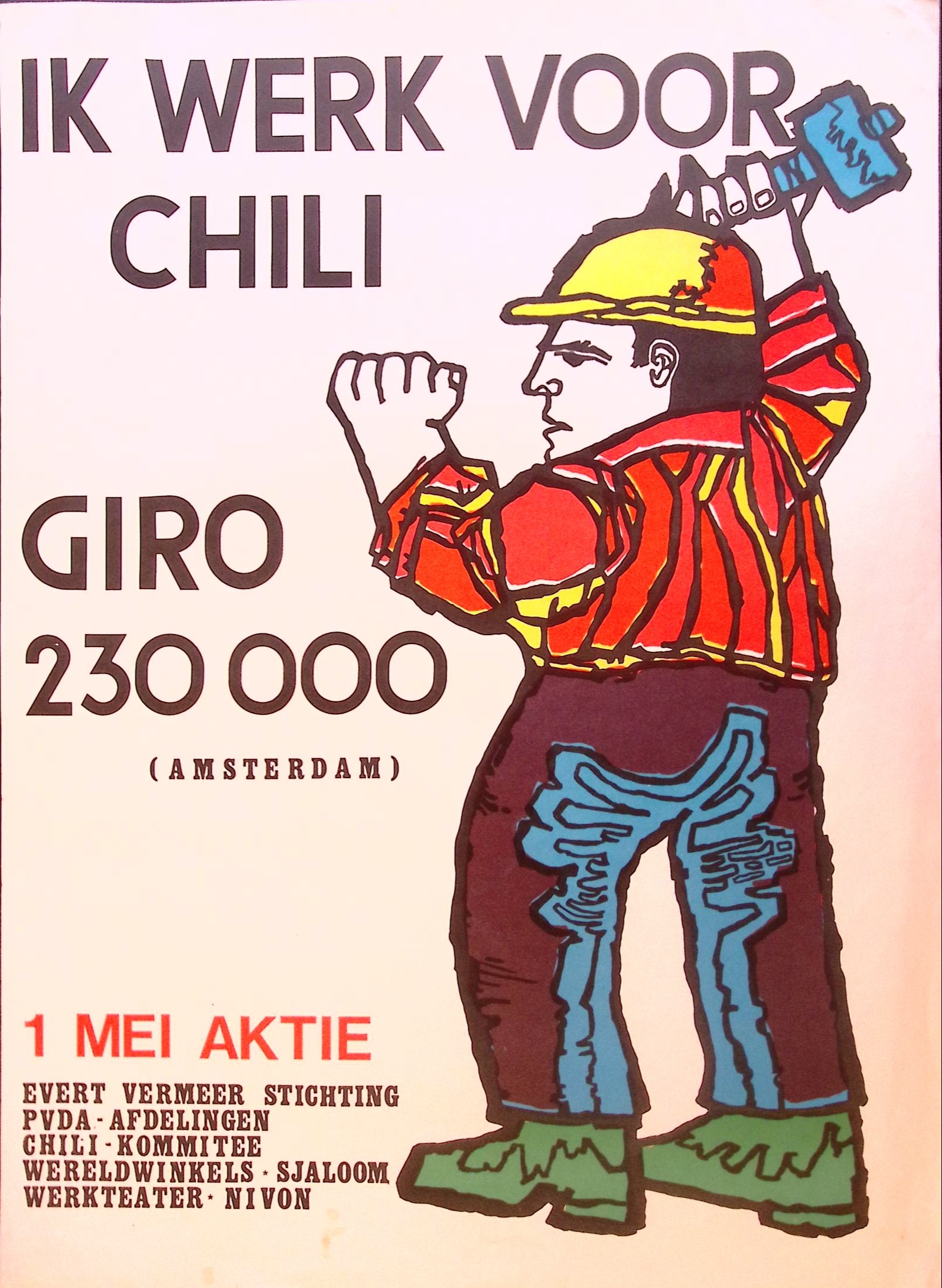IK WERK VOOR CHILI GIRO 230 000 (AMSTERDAM) 1 MEI AKTIE EVERT VERMEER STICHTING PVDA AFDELINGEN CHILI-KOMMITEE WERELDWINKELS SJALOOM, WERKTEATER NIVON. De prent heeft een afmeting van ca. 44 bij 61 centimeter.