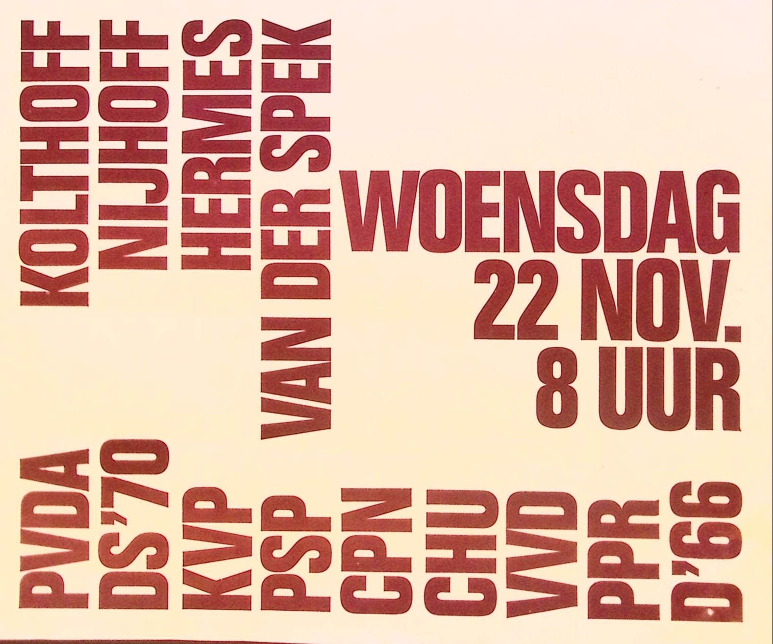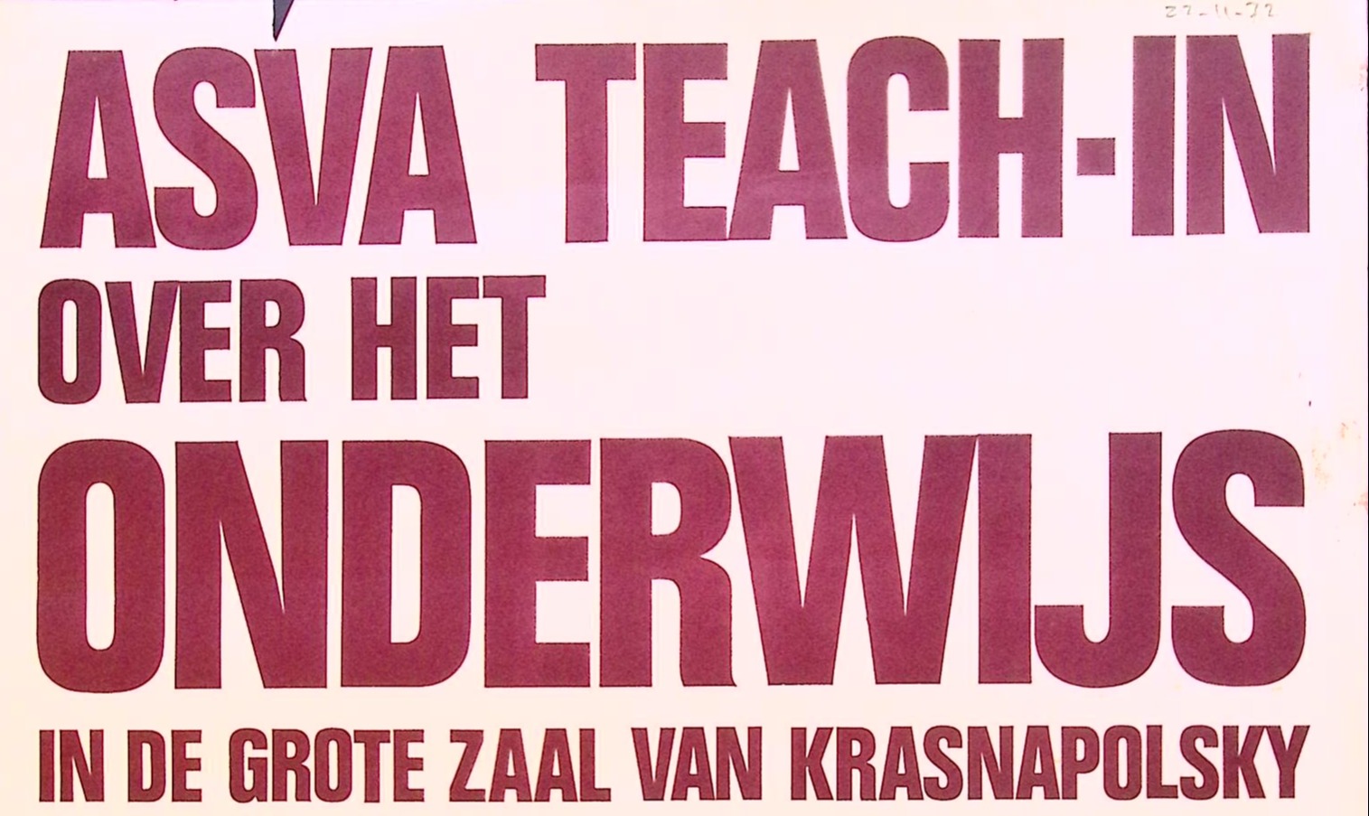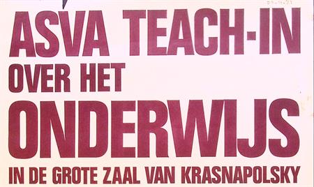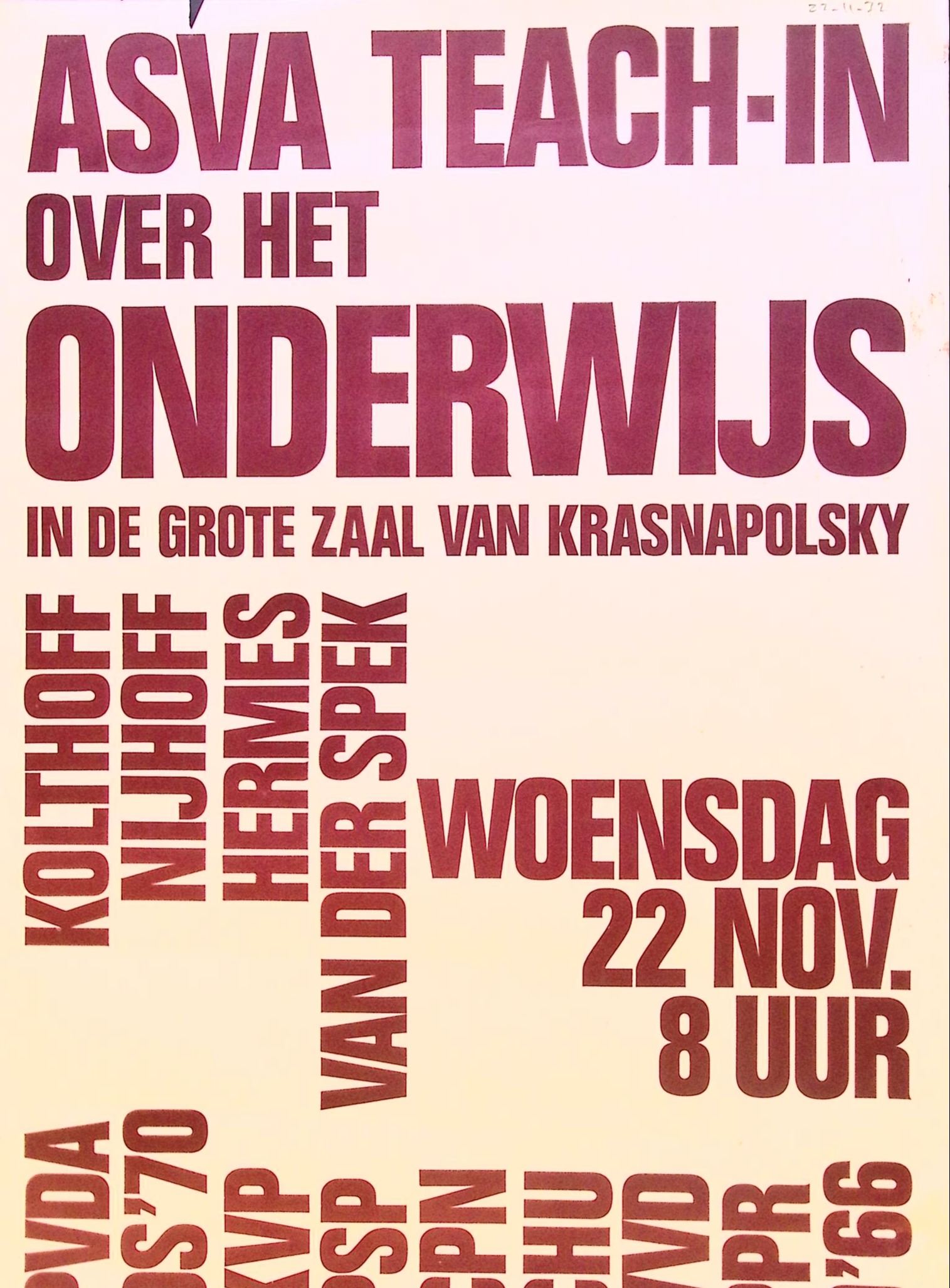 Asva teach-in over het onderwijs in de grote zaal van krasnapolsky, kolthoff, nijhoff, hermes, van der spek woensdag 22 nov. 8 uur.