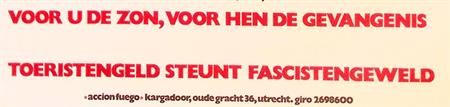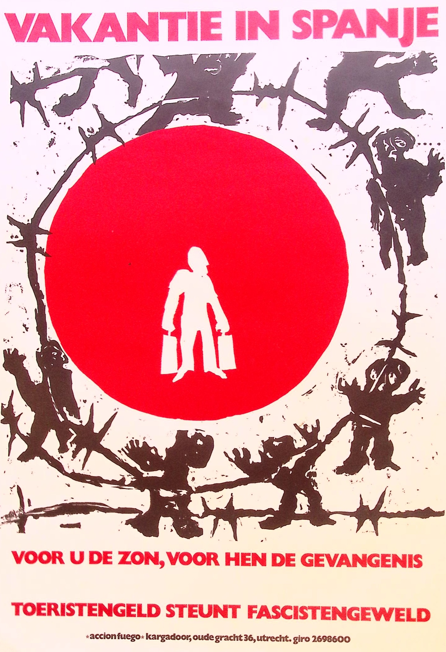 VAKANTIE IN SPANJE VOOR U DE ZON, VOOR HEN DE GEVANGENIS TOERISTENGELD STEUNT FASCISTENGEWELD accion fuego-kargadoor, oude gracht 36, utrecht. giro 2698600. De afmeting van deze prent is ca. 40 bij 59 centimeter.