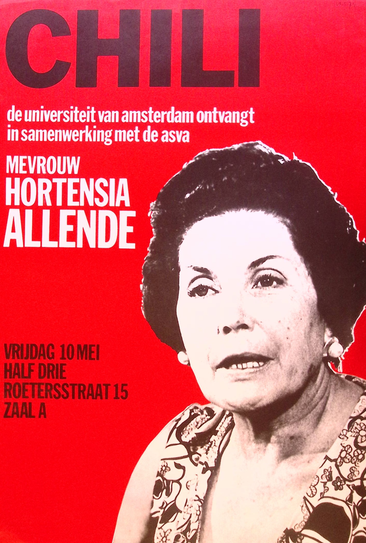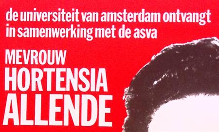 CHILI de universiteit van amsterdam ontvangt in samenwerking met de asva MEVROUW HORTENSIA ALLENDE V RIJDAG 10 MEI HALF DRIE ROETERSSTRAAT 15 ZAAL A. De prent heeft een afmeting van ca. 40 bij 59 centimeter.