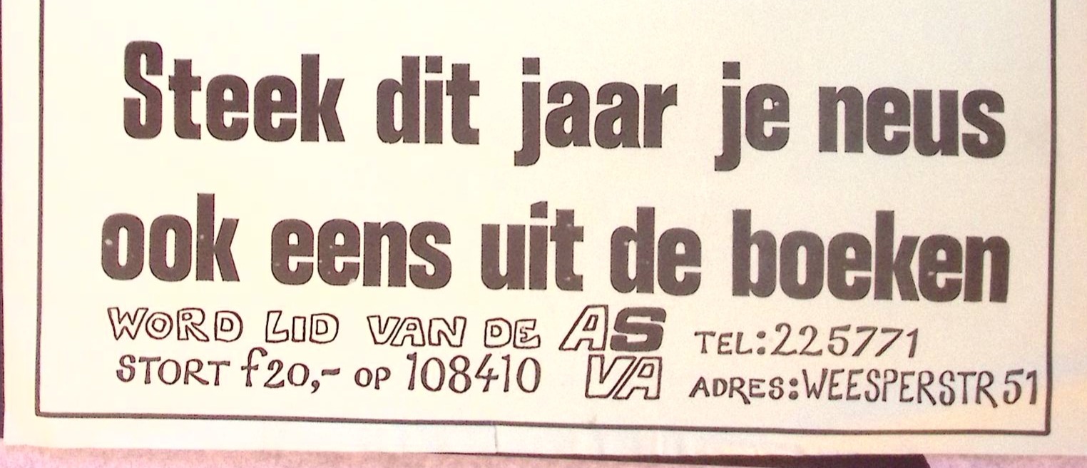 Steek dit jaar je neus ook eens uit de boeken word lid van de as tel:225771 stort f20,- op 108410 va adres:weesperstr 51.