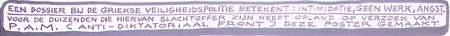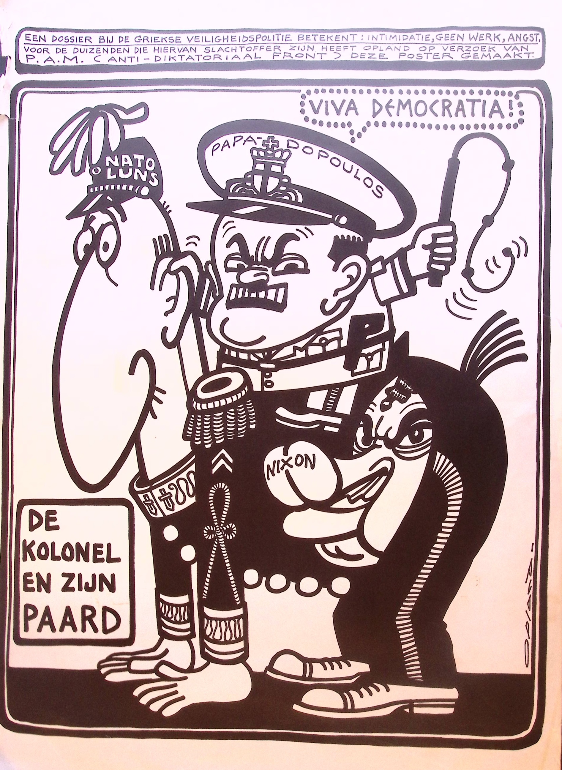 EEN DOSSIER BIJ DE GRIEKSE VEILIGHEIDSPOLITIE BETEKENT: INTIMIDATIE, GEEN WERK, ANGST VOOR DE DUIZENDEN DIE HIERVAN SLACHTOFFER ZIJN HEEFT OPLAND OP VERZOEK YAN P.A.M. ANTI-DIKTATORIAAL FRONT DEZE POSTER GEMAAKT NATO LUNS PAPADOPOULOS VIVA DEMOCRATIA! DE KOLONEL EN ZIJN PAARD NIXON. De prent heeft een afmeting van ca. 53 bij 72 centimeter.