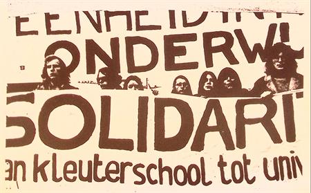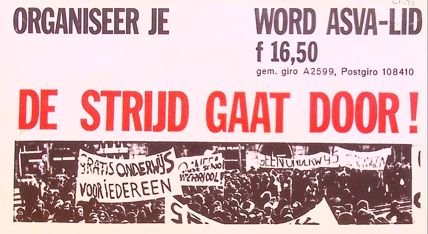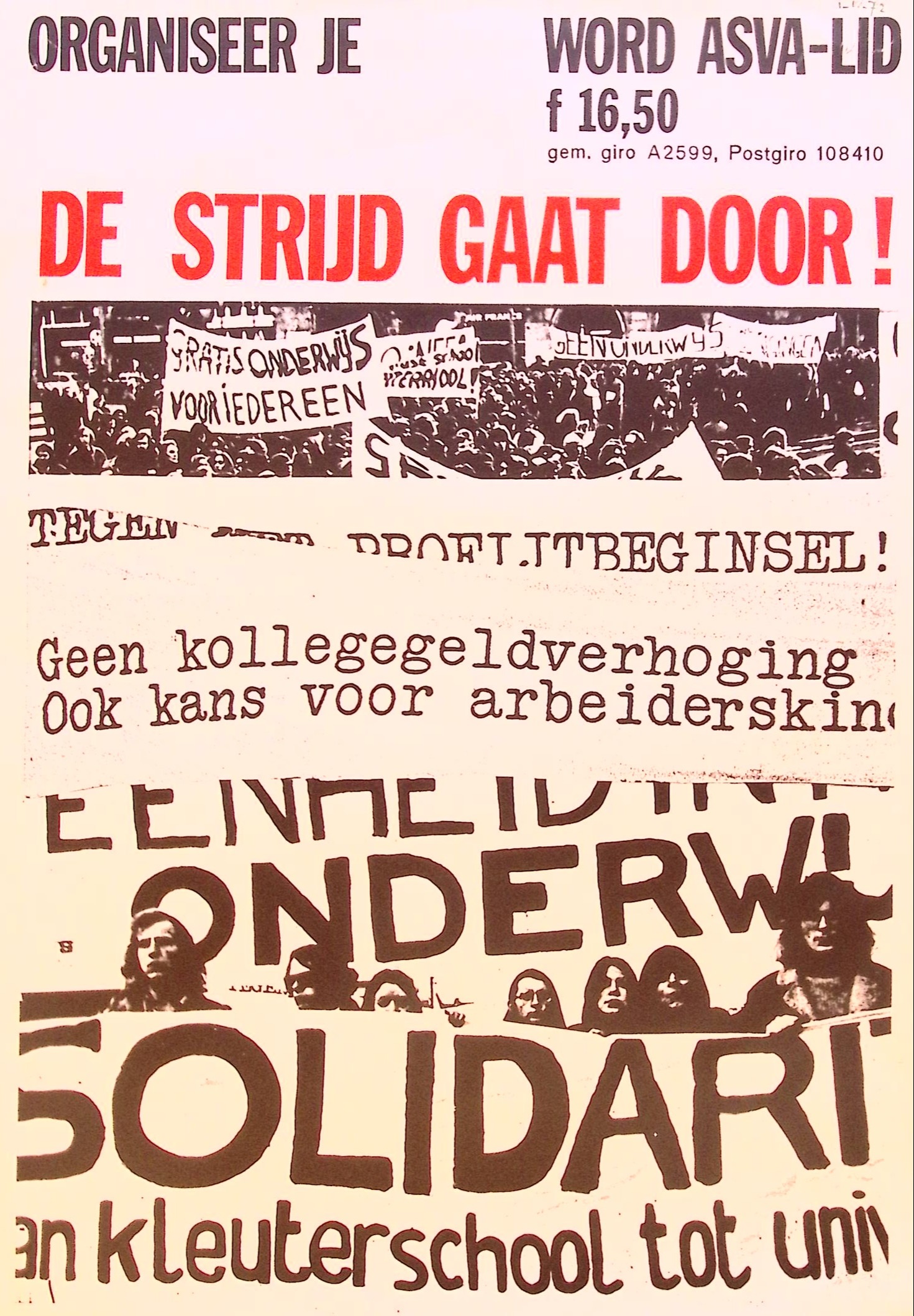 Organiseer je word asva-lid f 16,50 gem, giro a2599, postgiro 108410 de strijd gaat door! Voor iedereen tegen profijtbeginsel! Geen kollegegeldverhoging ook kans voor arbeiderskin solidari van kleuterschool tot uni.