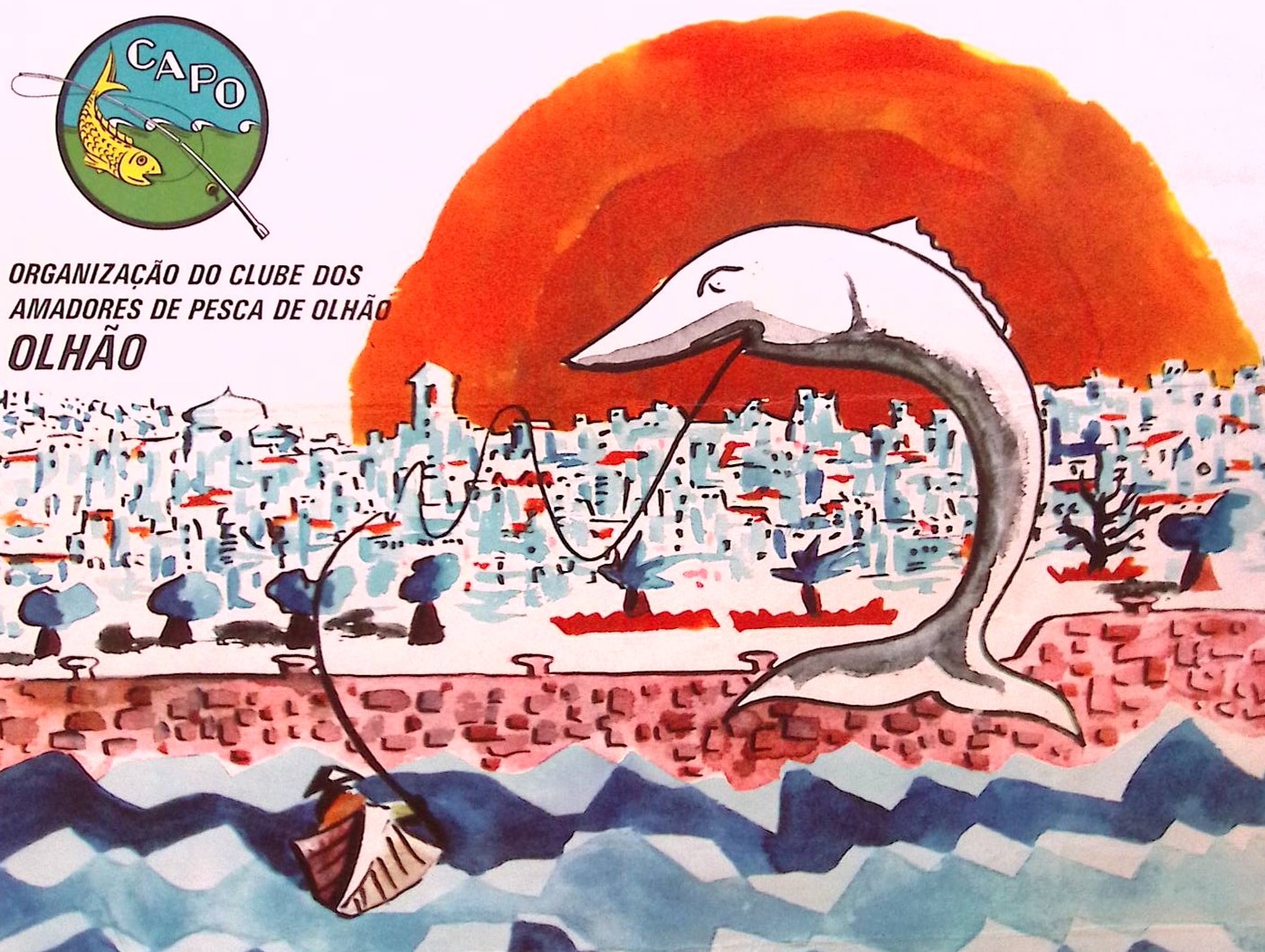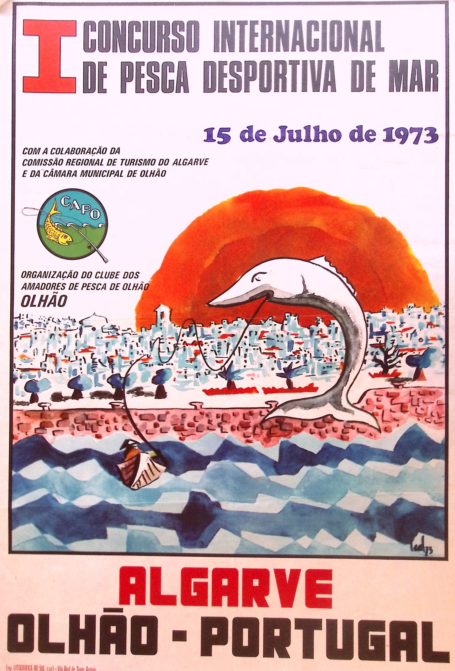 CONCURSO INTERNACIONAL DE PESCA DESPORTIVA DE MAR COM A COLABORAÇÃO DA COMISSÃO REGIONAL DE TURISMO DO ALGARVE E DA CÂMARA MUNICIPAL DE OLHÃO 15 de Julho de 1973 ORGANIZAÇÃO DO CLUBE DOS AMADORES DE PESCA DE OLHÃO OLHÃO ALGARVE OLHÃO-PORTUGAL. De afmeting van deze prent is ca. 42 bij 62 centimeter.