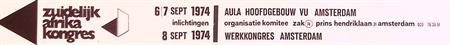 zuidelijk afrika kongres 67 SEPT 1974 AULA HOOFDGEBOUW VU AMSTERDA inlichtingen organisatie komitee zak prins hendriklaan amsterdam 8 SEPT 1974 WERKKONGRES AMSTERDAM ZUIDELIJK AFRIKA ARBEIDERSSTRIJD VRIJHEIDSSTRIJD. De afmeting van deze prent is ca. 39 bij 55 centimeter.