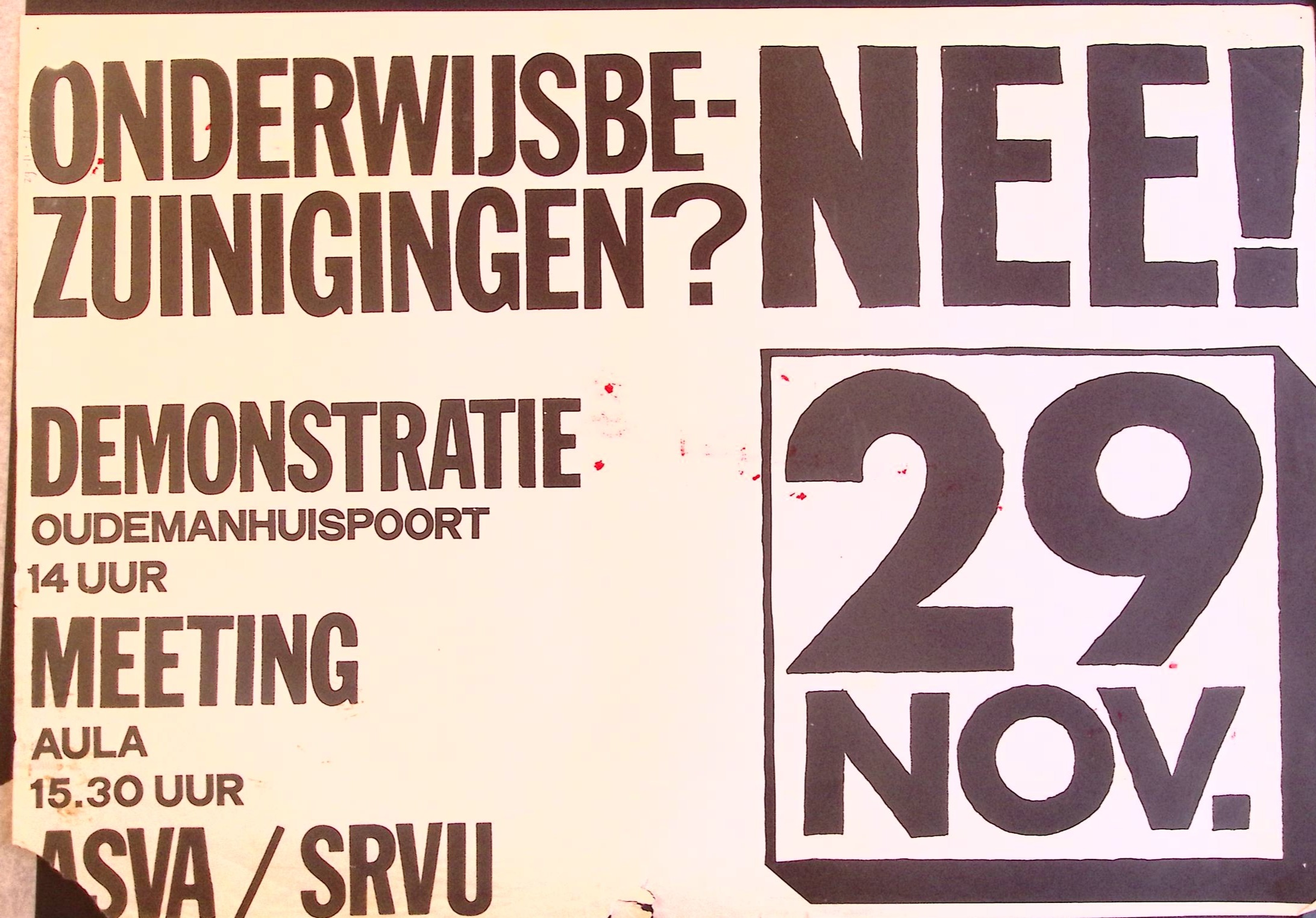 Onderwijsbezuinigingen? Nee! Demonstratie oudemanhuispoort 14 uur meeting aula 15.30 uur asva/srvu 29 nov.