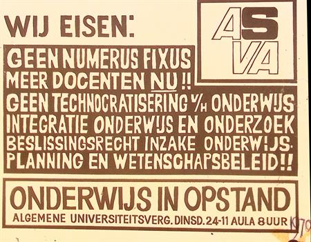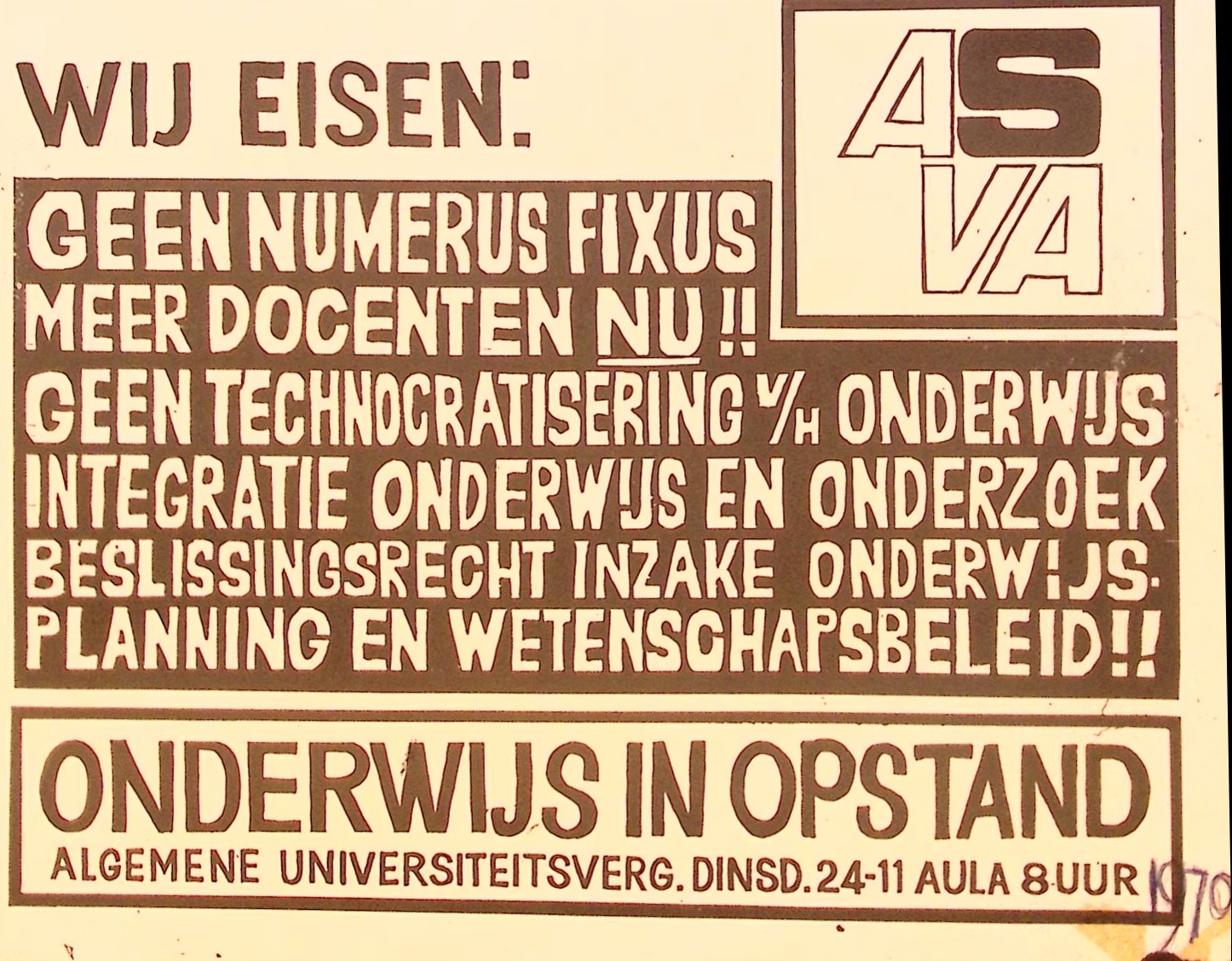 Afbraakplannen onderwijs wat zijn de konsekwenties van posthumus! Wie is mc. Kinsey numerus fixus selektieve propedeuse wachtlijsten personeelsstop overloopfakulteiten blokprogramma's studieduurverkorting scheiding onderwijs/ onderzoek(posthumus) onderwijsplanning door posthumus technocraten (mckinsey) wij eisen: geen numerus fixus meer docenten nu!! Geen technocratisering / onderwijs integratie onderwijs en onderzoek beslissingsrecht inzake onderwijs. Planning en wetenschapsbeleid!! Onderwijs in opstand algemene universiteitsverg. Dinsd.24-11 aula 8uur.