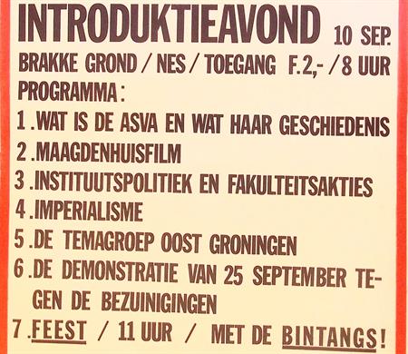 Asva introduktieavond 10 sep. Brakke grond/nes/toegang f.2,-/8 uur programma: 1.Wat is de asva en wat haar geschiedenis 2.Maagdenhuisfilm 3.Instituutspolitiek en fakulteitsakties 4.Imperialisme 5.De temagroep oost groningen 6.De demonstratie van 25 september te- gen de bezuinigingen 7.Feest/11 uur / met de bintangs!