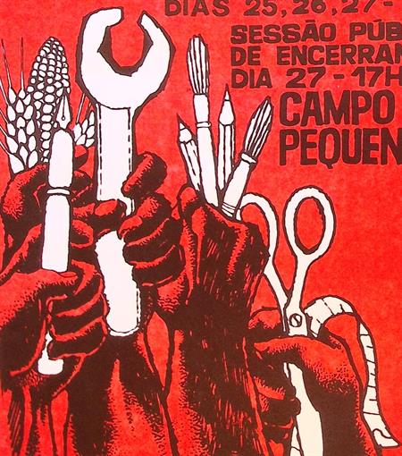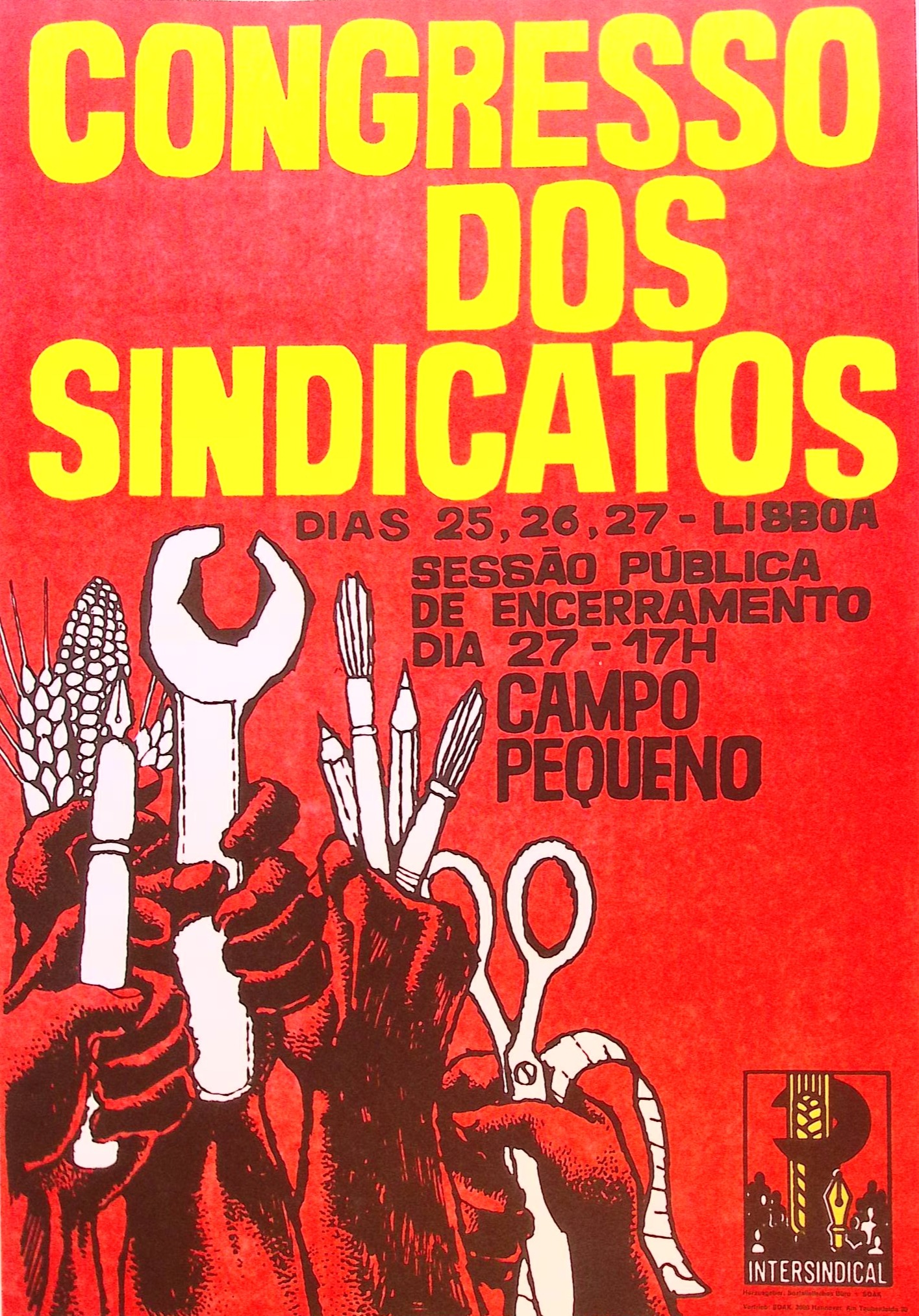 CONGRESSO DOS SINDICATOS DIAS 25,26,27 LISBOA SESSÃO PUBLICA DE ENCERRAMENTO DIA 27-17H CAMPO PEQUENO INTERSINDICAL. De prent heeft een afmeting van ca. 39 bij 56 centimeter.