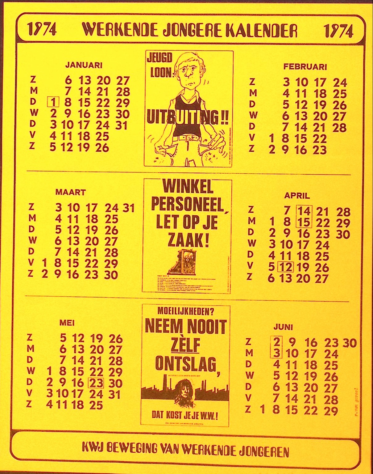 1974 werkende jongere kalender Jeugd loon uitbuiting!! Winkel personeel let op je zaak! Moeilijkheden? Neem nooit zelf ontslag dat kost je je ww.! Kwj beweging van werkende jongeren.