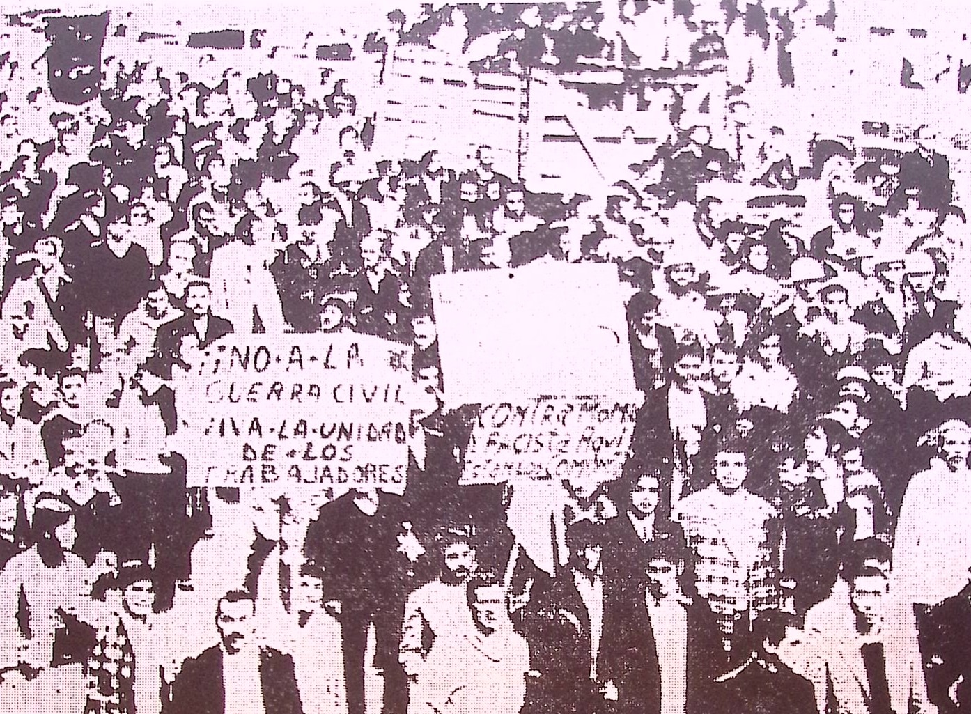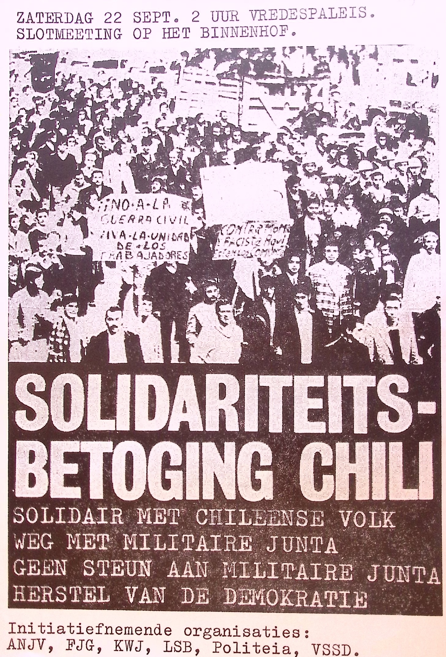 ZATERDAG 22 SEPT. 2 UUR VREDESPALEIS. SLOTMEETING OP HET BINNENHOF. NO-A-LP GUERRA CIVIL VIVA LA UNIDAD DE LOS TRABAJADORES SOLIDARITEITS- BETOGING CHILI SOLIDAIR MET CHILEENSE VOLK WEG MET MILITAIRE JUNTA GEEN STEUN AAN MILITAIRE JUNTA HERSTEL VAN DE DEMOKRATIE Initiatiefnemende organisaties: ANJV, FJG, KWJ, LSB, Politeia, VSSD. De prent heeft een afmeting van ca. 40 bij 60 centimeter.