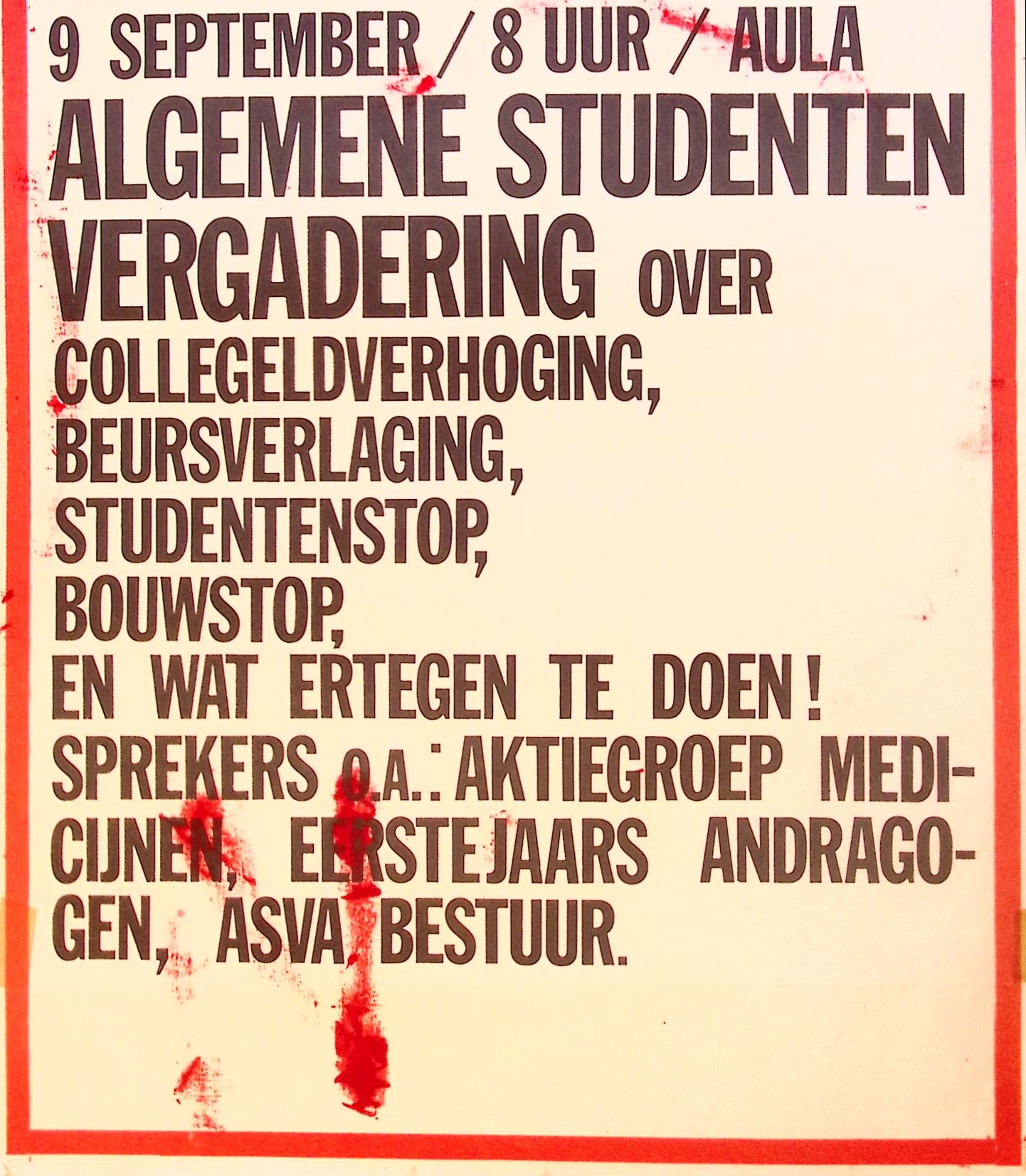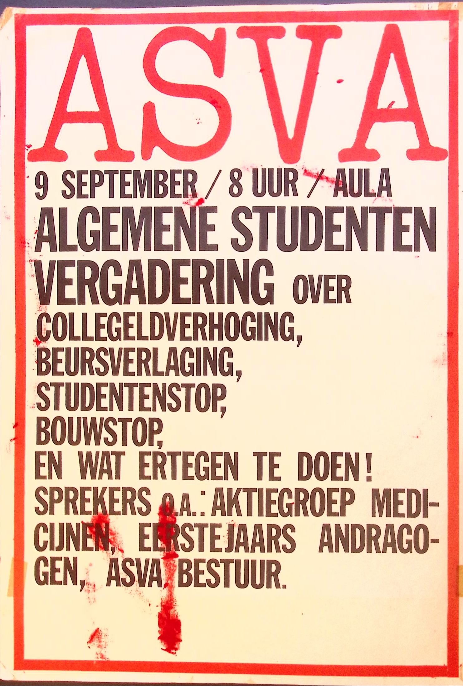 Asva 9 september/8 uur aula algemene studenten vergadering over collegeldverhoging, beursverlaging, studentenstop, bouwstop, en wat ertegen te doen! Sprekers a.: aktiegroep medi- cijnen eerstejaars andrago- gen, asva bestuur.