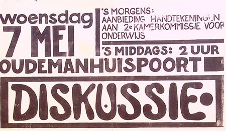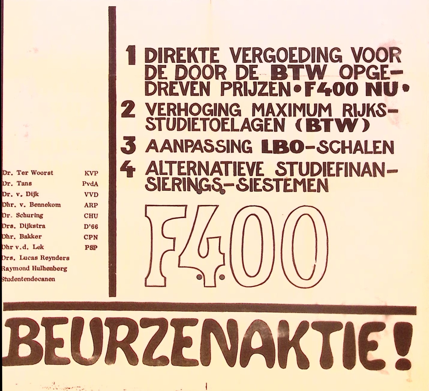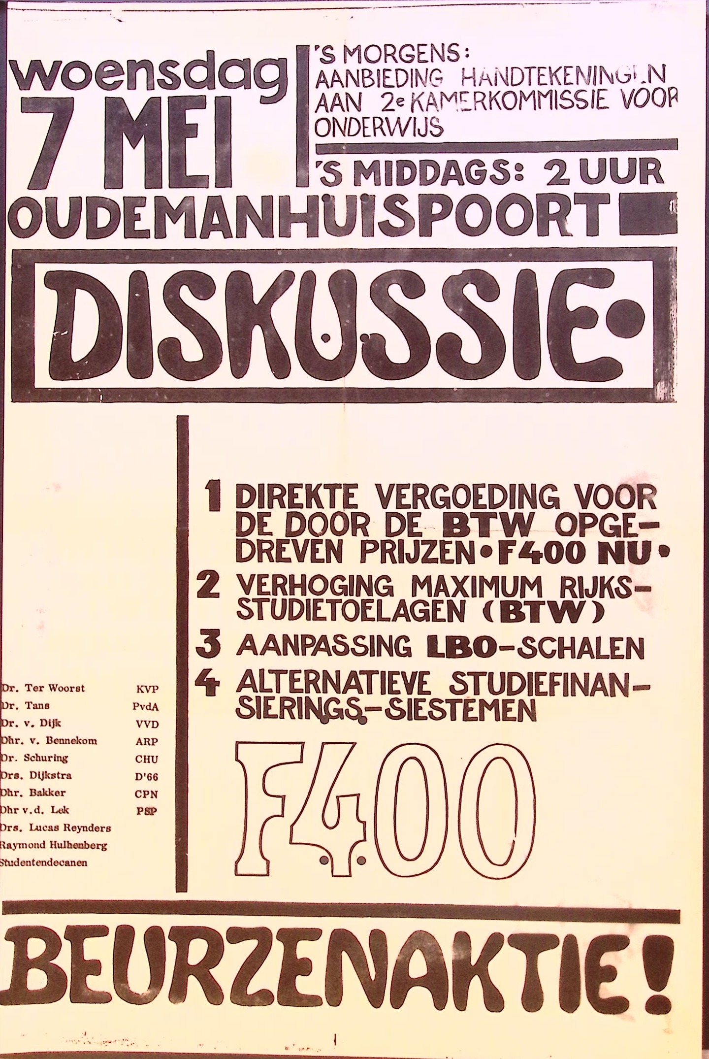 's morgens: woensdag aanbieding 7 mei handtekening n aan 2 kamerkommissie voor onderwijs 's middags: 2 uur oudemanhuispoort diskussie 1 direkte vergoeding voor de door de btw opge- dreven prijzen f400 nu 2 verhoging maximum rijks- studietoelagen (btw) 3 aanpassing lbo-schalen 4 alternatieve studiefinan- sierings-siestemen f400 beurzenaktie! Dr. Ter woorst kvp dr. Tan pvda dr. V. Disk vvd ohr. V. Bennekom arp dr. Schuring chu drs. Dijkstra d'66 dhr. Bakker ohrv.D. Lek drs. Lucas reynders raymond halbenberg studentendecanen cpn psp.