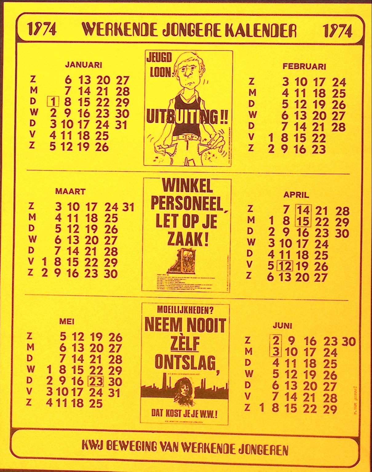 Werkende jongeren kalender jeugdloon uitbuiting! Winkel personeel, let op je zaak! Moeilijkheden? Neem nooit zelf ontslag dat kost je je W.W!