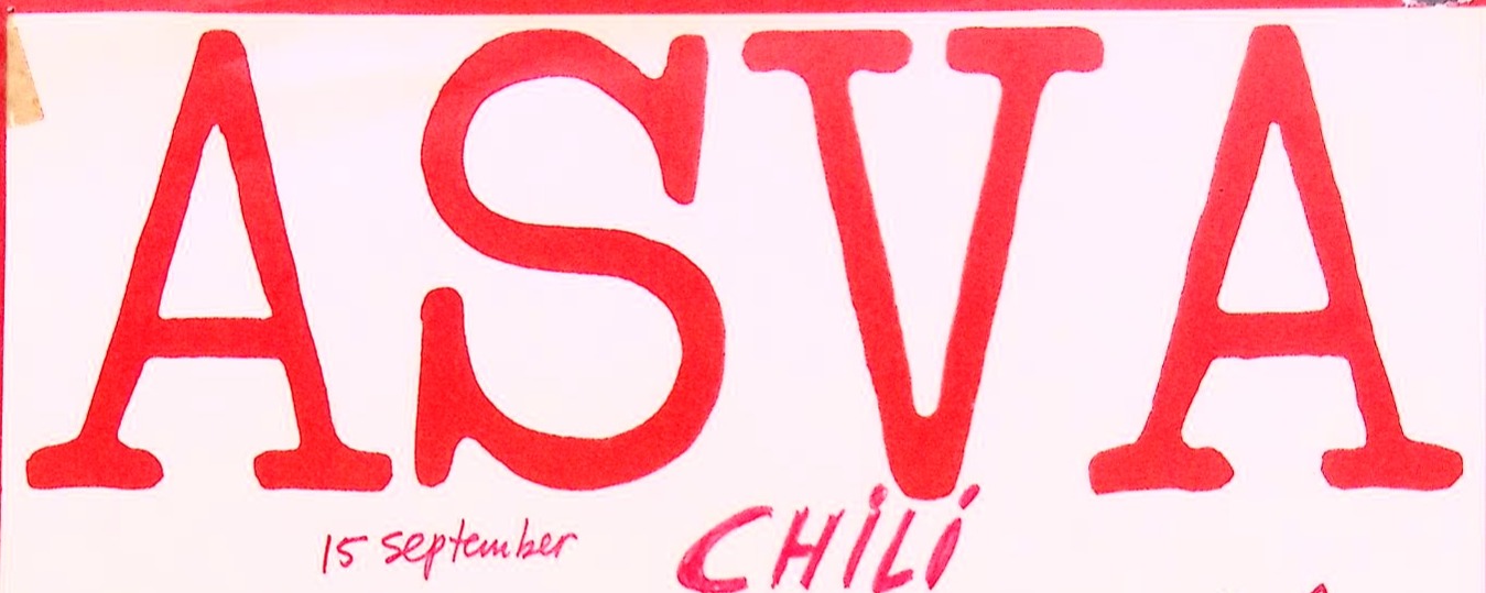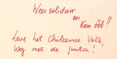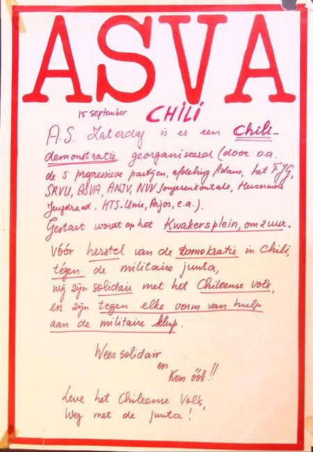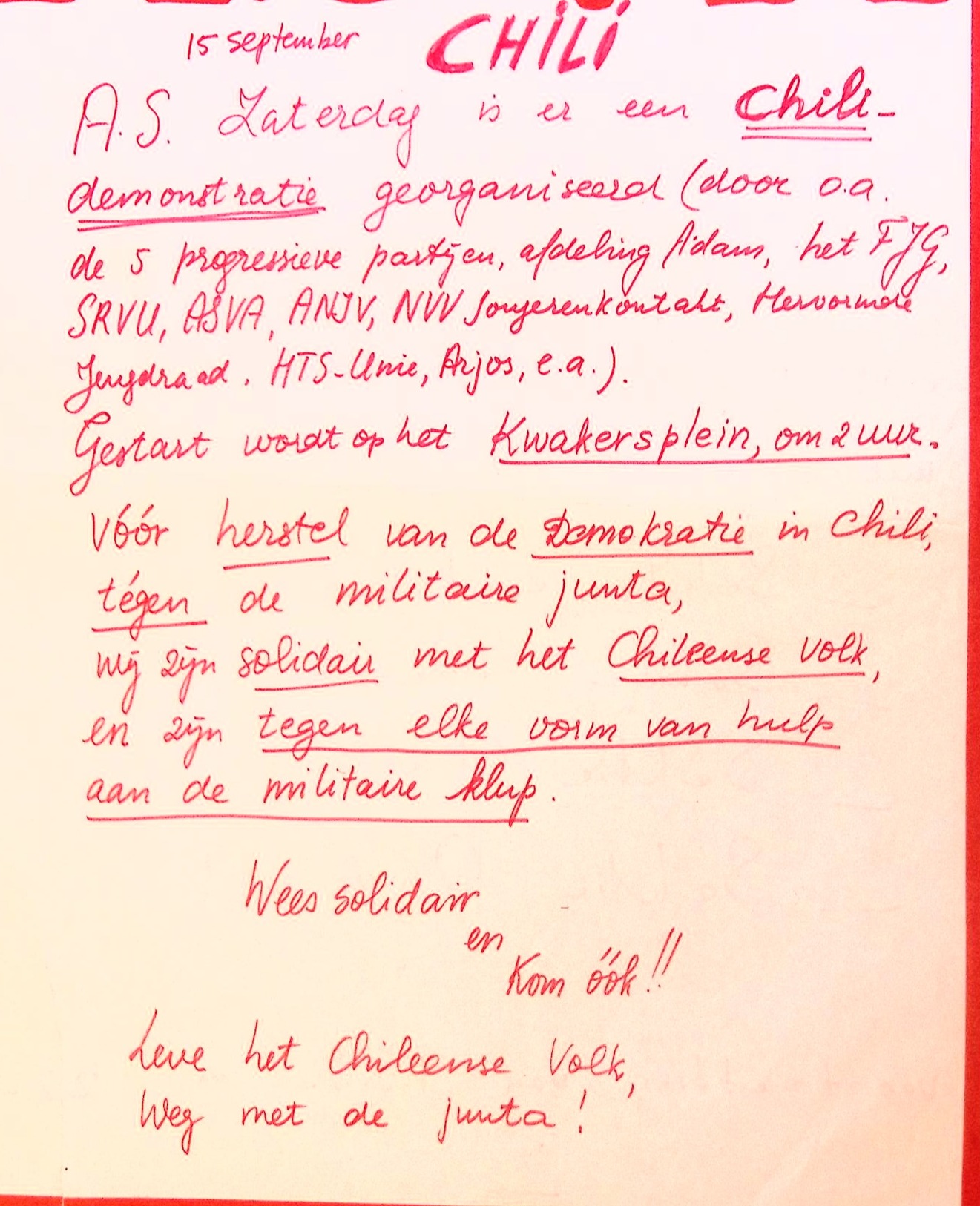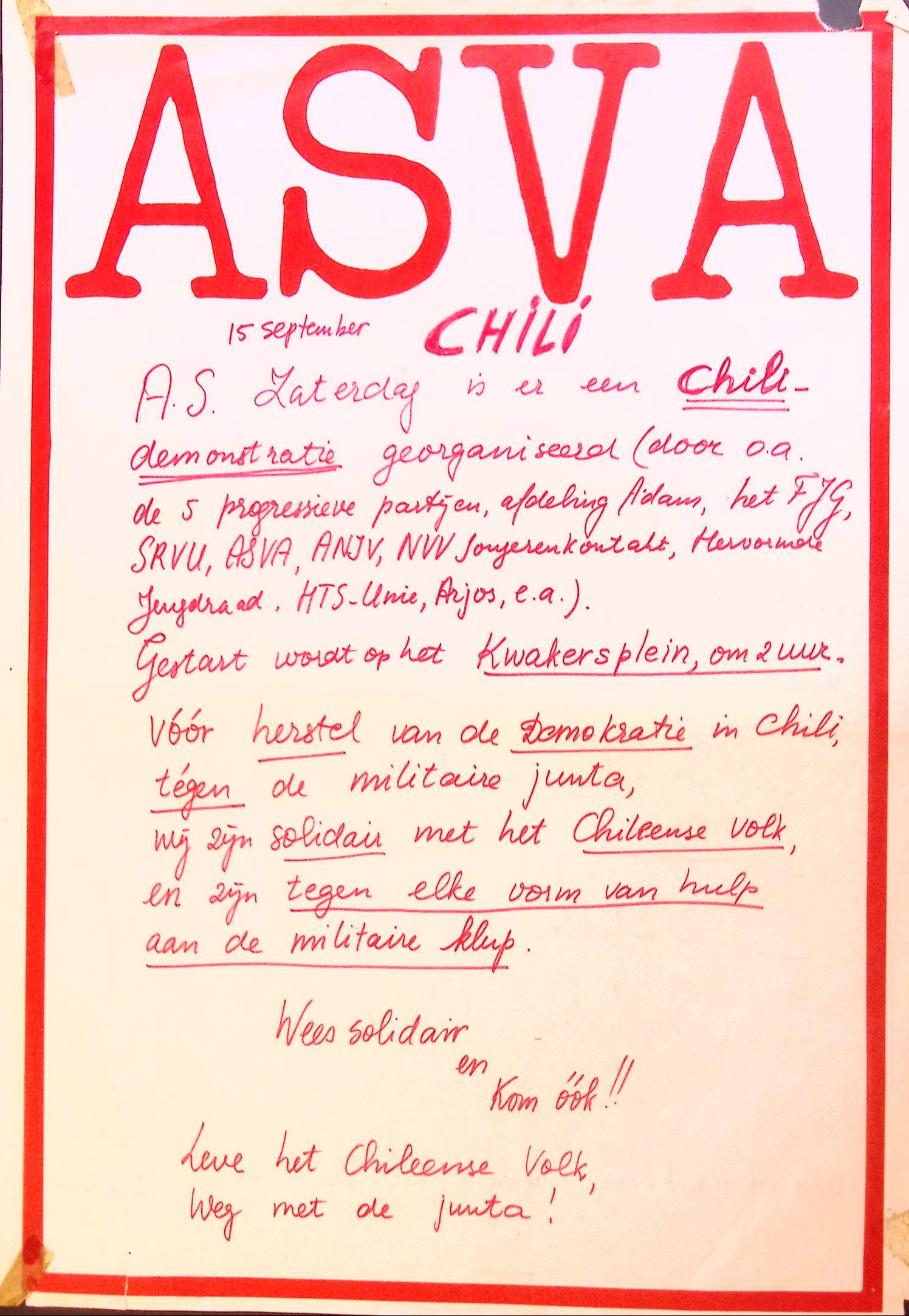 Asva 15 september chili a.S. Zaterdag is er een chili- demonstratie georganiseerd (door o.A. De 5 progressieve partijen, afdeling adam, het ffg, srvu, asva, anjv, nv jongerenkontalt, hervormore jugdraad. Hts-unie, arjos, e.A.). Gestast wordt op het kwakers plein, om 2 uur. Vóór herstel van de demokratie in chili, tegen de militaire junta, mij zijn solidair met het chileense volk, en zijn tegen elke vorm van hulp aan de militaire klup. Wees solidair en kom ook!! Leve het chileense volk, met de junta! Weg.