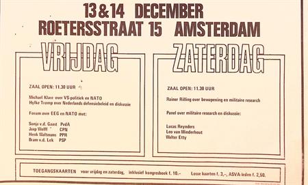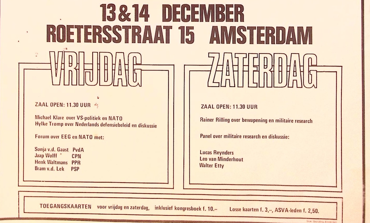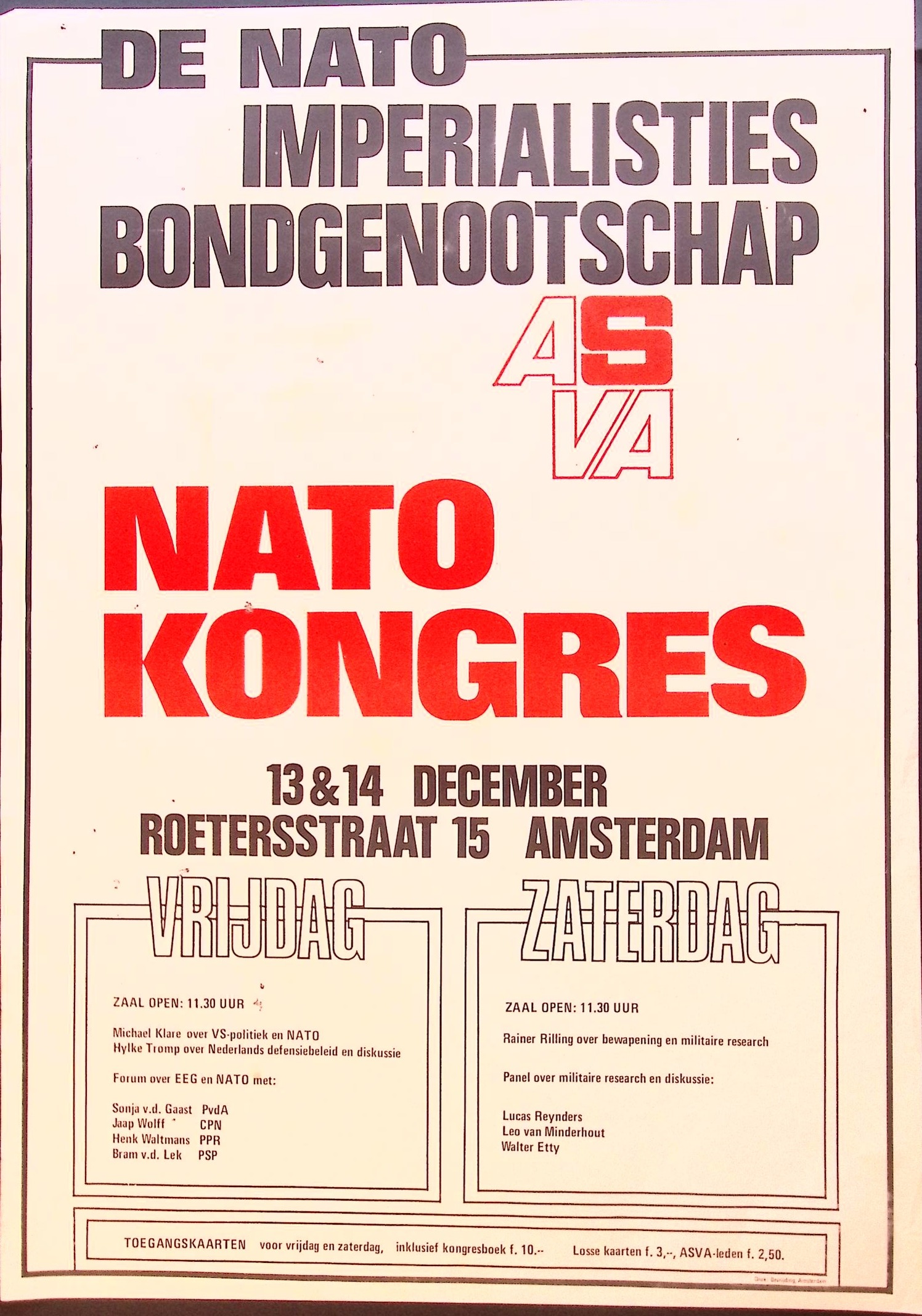 De nato- imperialisties bondgenootschap asva nato kongres 13&14 december roetersstraat 15 amsterdam vrijdag zaal open: 11.30 uur michael klare over vs-politiek en nato hylke tromp over nederlands defensiebeleid en forum over eeg en nato sod. Pa hesk walt cpn ppr brand lek psp Zaterdag zaal open: 11.30 uur rainer rilling over bewapening en militaire research panel over militaire researched latas reynders leo was minderhout walter etty toegangskaarten ver weg en zaterdag, inklusief kongresboek f. 18- love karten 1.3, asva 2,50.