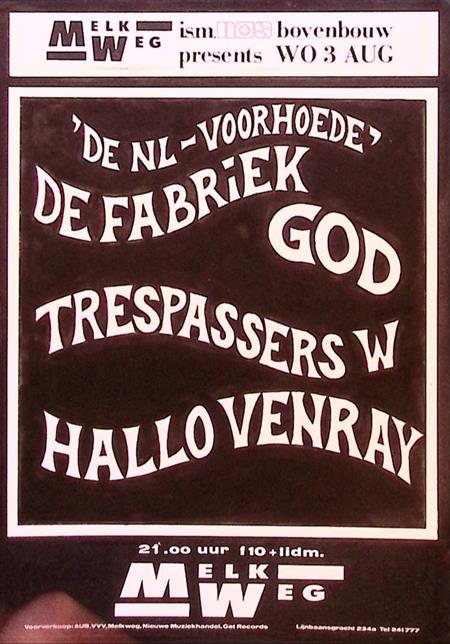 MelkWeg ism.NOS bovenbouw presents WO 3 AUG 'DE NL-VOORHOEDE' DE FABRIEK GOD TRESPASSERS W HALLO VENRAY 21.00 uur 110+lidm. MELK WEG Voorverkoop: AUB.VVV,Melkweg. Nieuwe Muziekhandel, Get Records EG Lijnbaansgracht 234a Tel 241777. De prent heeft een afmeting van ca. 20 bij 29 centimeter.