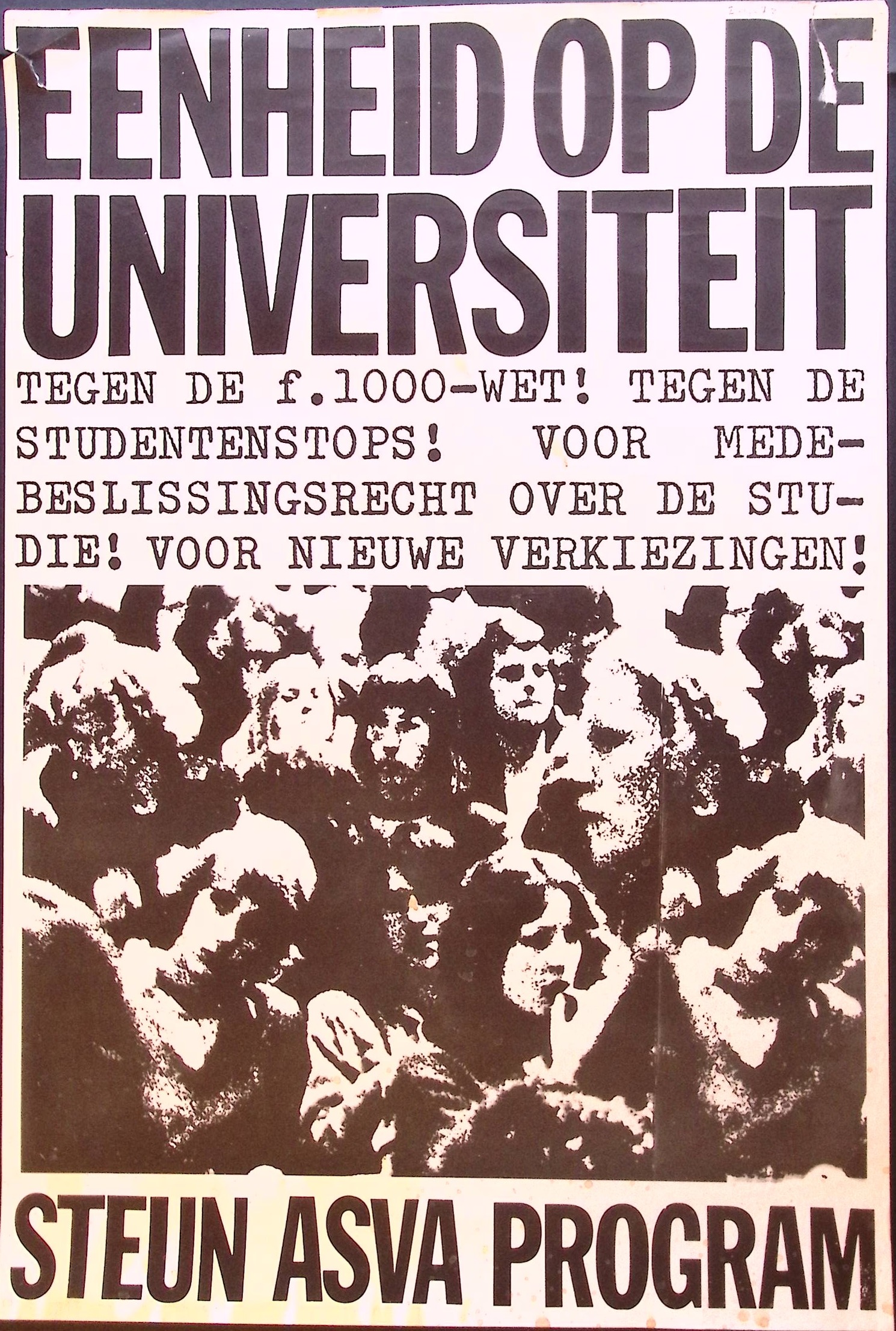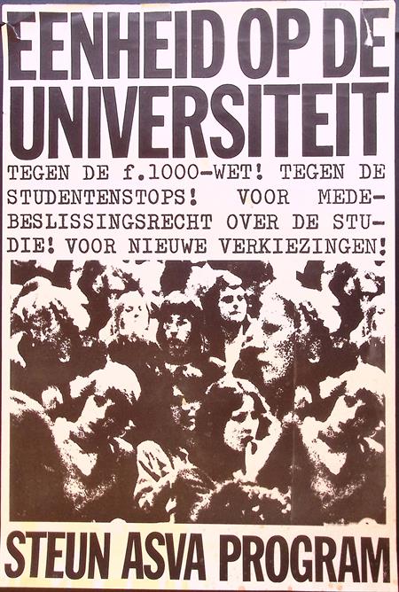 Eenheid op de universiteit tegen de f.1000-wet! Tegen de studentenstops! Voor mede- beslissingsrecht over de stu-die voor nieuwe verkiezingen! Steun asva program.