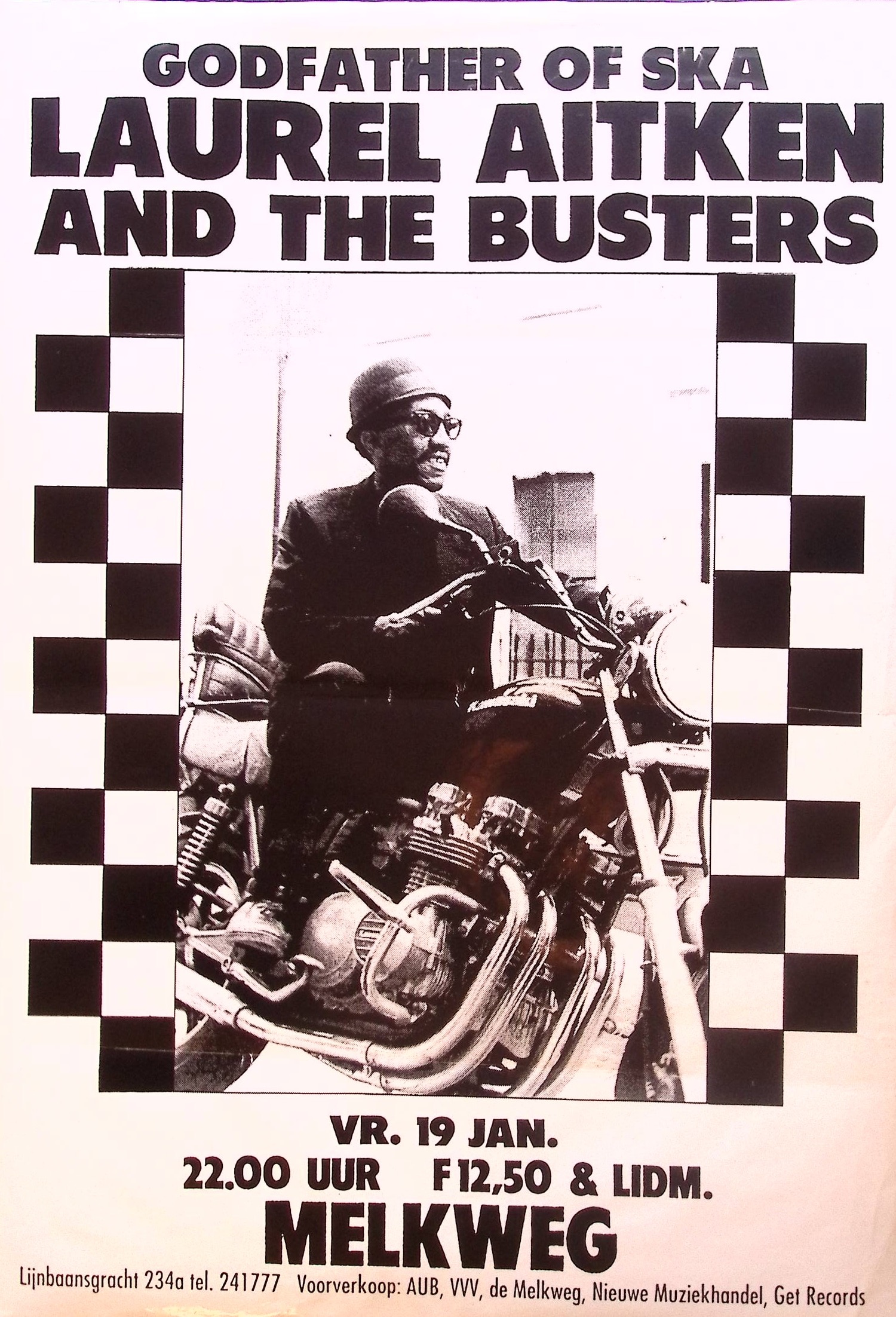 GODFATHER OF SKA LAUREL AITKEN AND THE BUSTERS VR. 19 JAN. 22.00 UUR F12,50 & LIDM. MELKWEG Lijnbaansgracht 234a tel. 241777 Voorverkoop: AUB, VVV, de Melkweg, Nieuwe Muziekhandel, Get Records. De afmeting van deze prent is ca. 41 bij 61 centimeter.