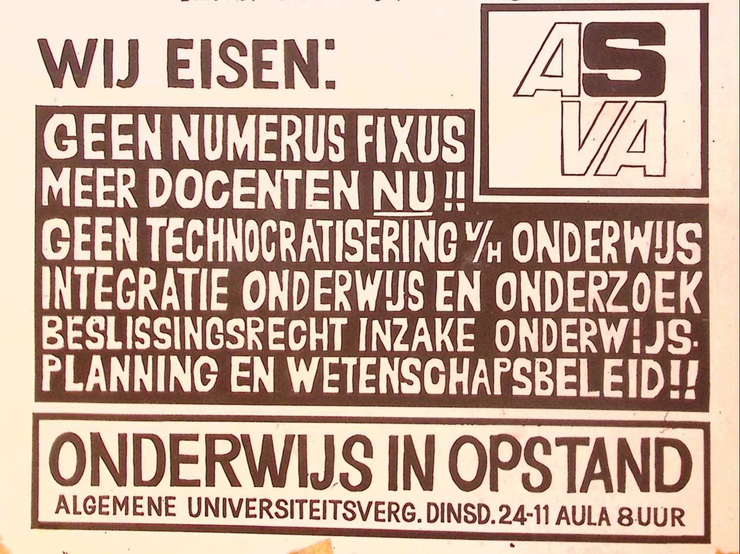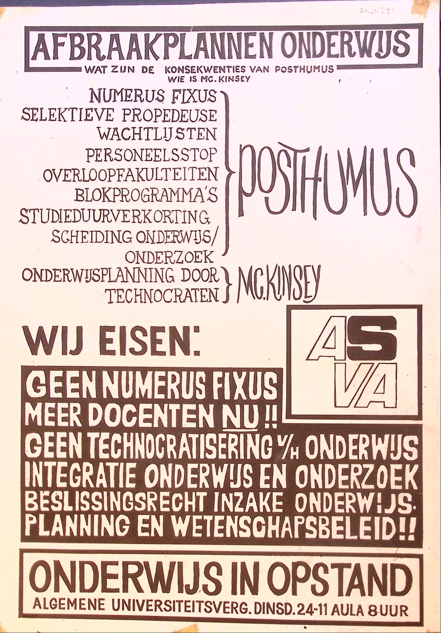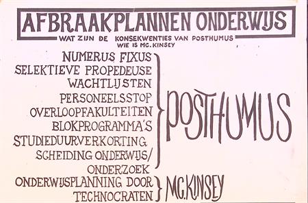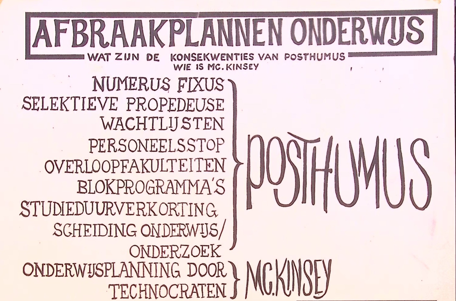Afbraakplannen onderwijs wat zun de konsekwenties van posthumus! Wie is mc. Kinsey Posthumus. numerus fixus, selektieve propedeuse, wachtlijsten, personeelsstop, overloopfakulteiten, blokprogramma's, studieduurverkorting, scheiding onderwijs/, onderzoek Onderwijsplanning door mckinsey. onderwijs/onderzoek, technocraten Wij eisen: geen numerus fixus meer docenten nu!!! geen technocratisering/onderwijs integratie onderwijs en onderzoek beslissingsrecht inzake onderwijs planning en wetenschapsbeleid!! Onderwijs in opstand algemene universiteitsverg. Dinsd.24-11 aula 8uur.