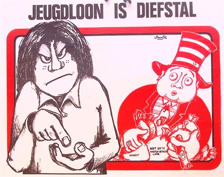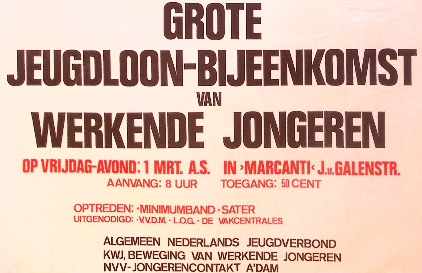 Jeugdloon is diefstal winst Grote jeugdloon-bijeenkomst van werkende jongeren Op vrijdag-avond: 1 mrt. A.S. In marcanti j..Galenstr. Aanvang: 8 uur toegang: 50 cent optreden: minimumband sater uitgenodigd: vvdm log de vakcentrales Algemeen nederlands jeugdverbond kwj, beweging van werkende jongeren nvv-jongerencontakt a'dam.