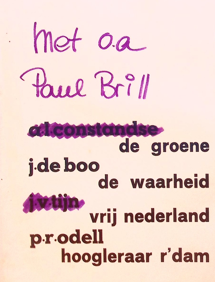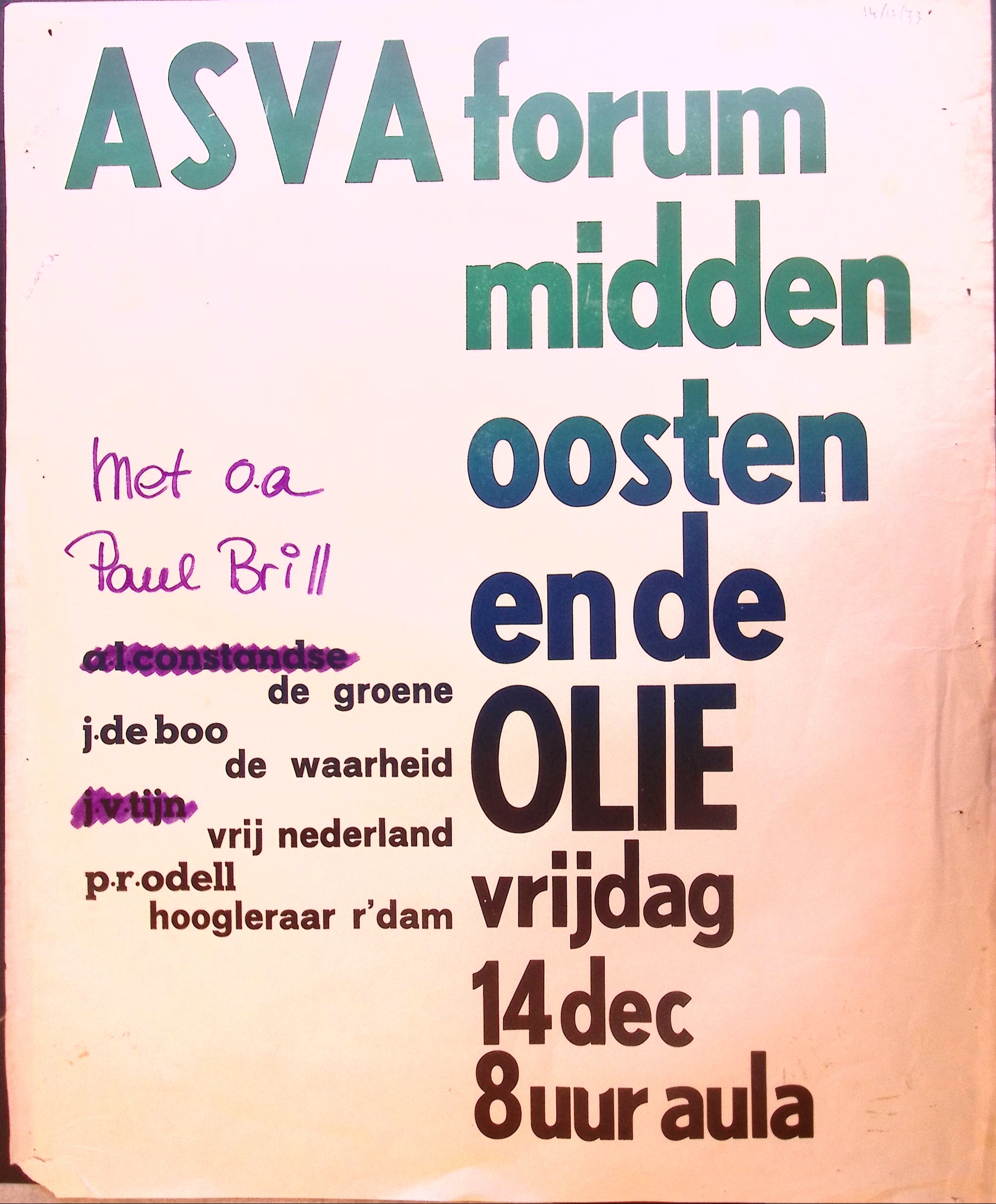 Asva forum midden met oa paul brill constantse de groene j.De boo p.R.Odell de waarheid vrij nederland hoogleraar r'dam oosten ende olie vrijdag 14dec 8uur aula.