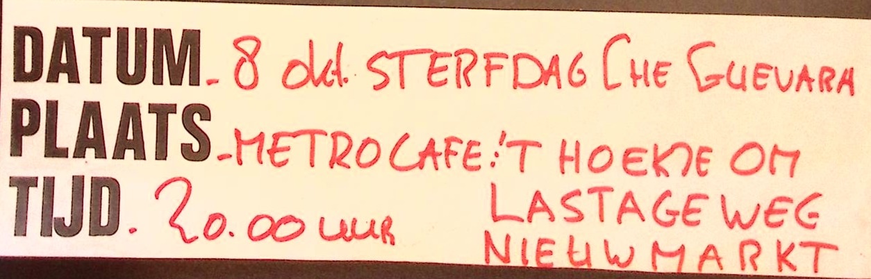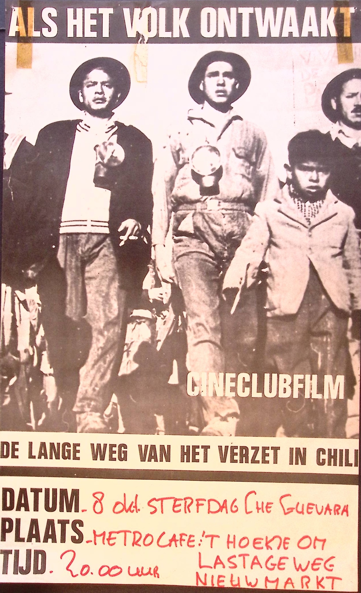 ALS HET VOLK ONTWAAKT CINECLUBFILM DE LANGE WEG VAN HET VERZET IN CHILI DATUM 8 STERFDAG CHE GUEVARA PLAATS METRO CAFE! T HOEKIE OM LASTAGE WEG NIEUWMARKT TIJD. 20.00 uur. De afmeting van deze prent is ca. 35 bij 58 centimeter.