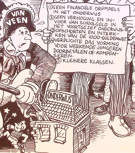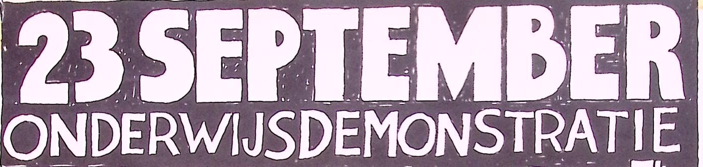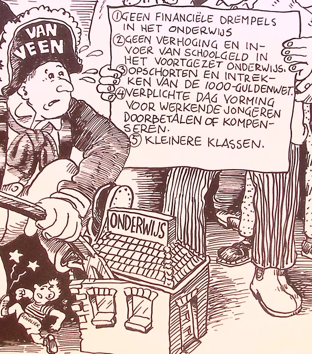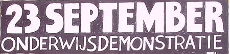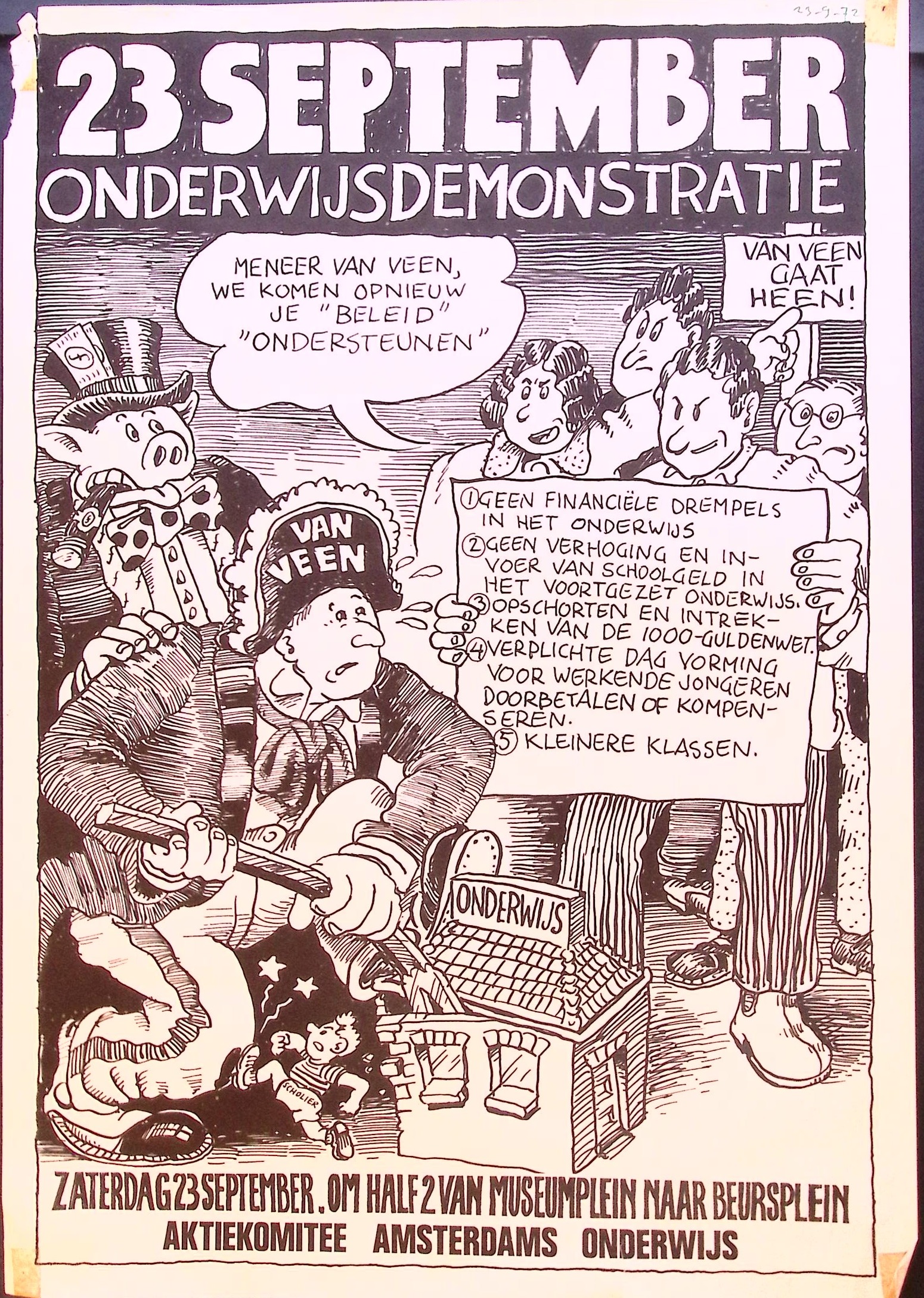 23 september onderwijsdemonstratie In het plaatje staat: meneer van veen, we komen opnieuw je "Beleid" "Ondersteunen" van veen gaat heen! Van veen ogeen financiële drempels in het onderwijs geen verhoging en in- voer van schoolgeld in het voortgezet onderwijs. Opschorten en intrek- ken van de 1000-guldenwet. Verplichte dag vorming voor werkende jongeren doorbetalen of kompen- seren. 5 kleinere klassen. Onderwijs Zaterdag23 september.Om half2 van museumplein naar beursplein aktiekomitee amsterdams onderwijs.