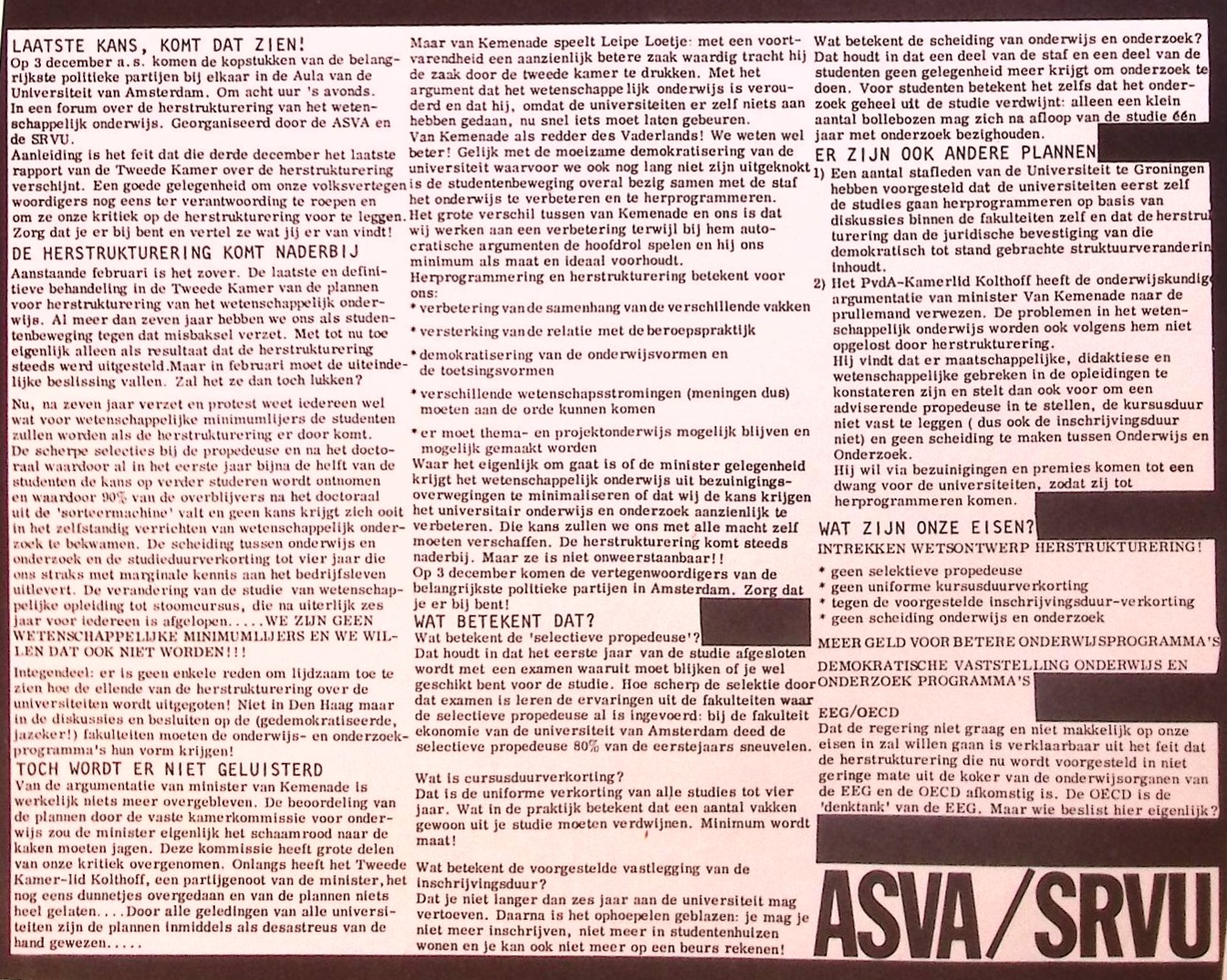 Let op! Mr. Herstrukturering komt er aan! Politiek forum cne va cp andré de leuw ppr faber pvda kees kolthoff fred van der spek over intrekking wetsontwerp herstrukturering 3 december, 20.00 uur in de aula aan het spui Asva/srvu.