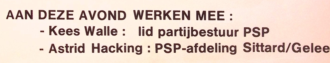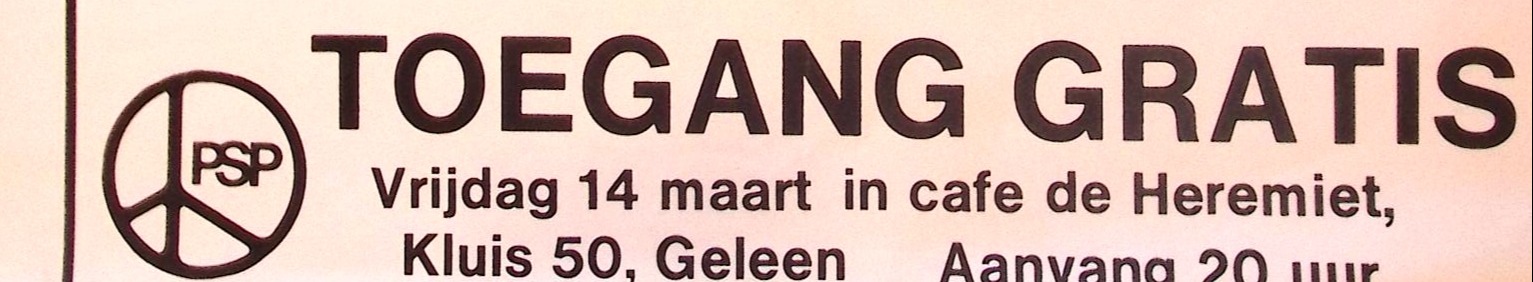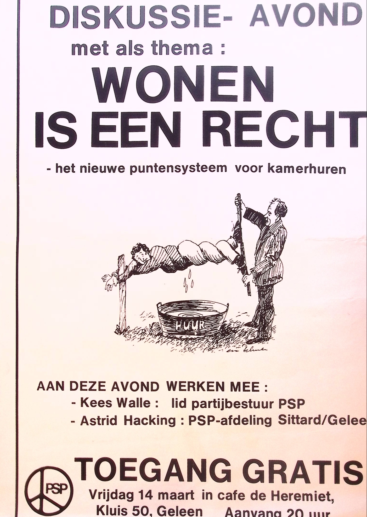 DISKUSSIE- AVOND met als thema : WONEN IS EEN RECHT - het nieuwe puntensysteem voor kamerhuren HUUR AAN DEZE AVOND WERKEN MEE : PSP - Kees Walle lid partijbestuur PSP - Astrid Hacking: PSP-afdeling Sittard/Gelee TOEGANG GRATIS Vrijdag 14 maart in cafe de Heremiet, Kluis 50, Geleen Aanvang 20 r. De prent heeft een afmeting van ca. 43 bij 60 centimeter.