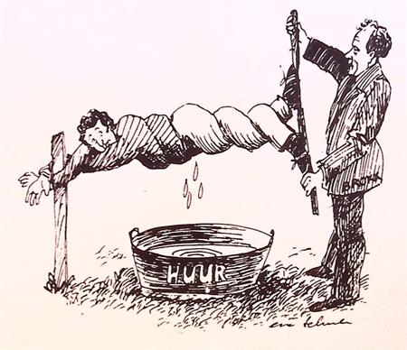 De Pacifistisch Socialistische Partij (PSP) was een Nederlandse politieke partij actief van 1957 tot 1991 en is opgegaan in Groen Links. Spotprenten die gaan over wonen laten zien hoe het thema leeft in de maatschappij, bijvoorbeeld door huizen als onbetaalbare kastelen of piepkleine hokjes af te beelden. Ze bekritiseren op ludieke wijze beleid en marktwerking binnen de woonsector. Die scherpe visualisaties zetten aan tot discussie over hoe we omgaan met de woonproblematiek. Spotprenten vergroten zo de maatschappelijke impact van het onderwerp wonen. Thema’s rondom recht zijn in spotprenten geliefd vanwege hun maatschappelijke impact en de mogelijkheid tot scherpe satire. Vaaks worden situaties uitvergroot om aan te tonen hoe rechtspraak werkt, faalt of juist wordt gemanipuleerd. Met humor en overdrijving bieden spotprenten ruimte voor kritiek op wetten, rechters of het juridische apparaat. Hierdoor wordt het onderwerp toegankelijk en bespreekbaar gemaakt voor een breed publiek.