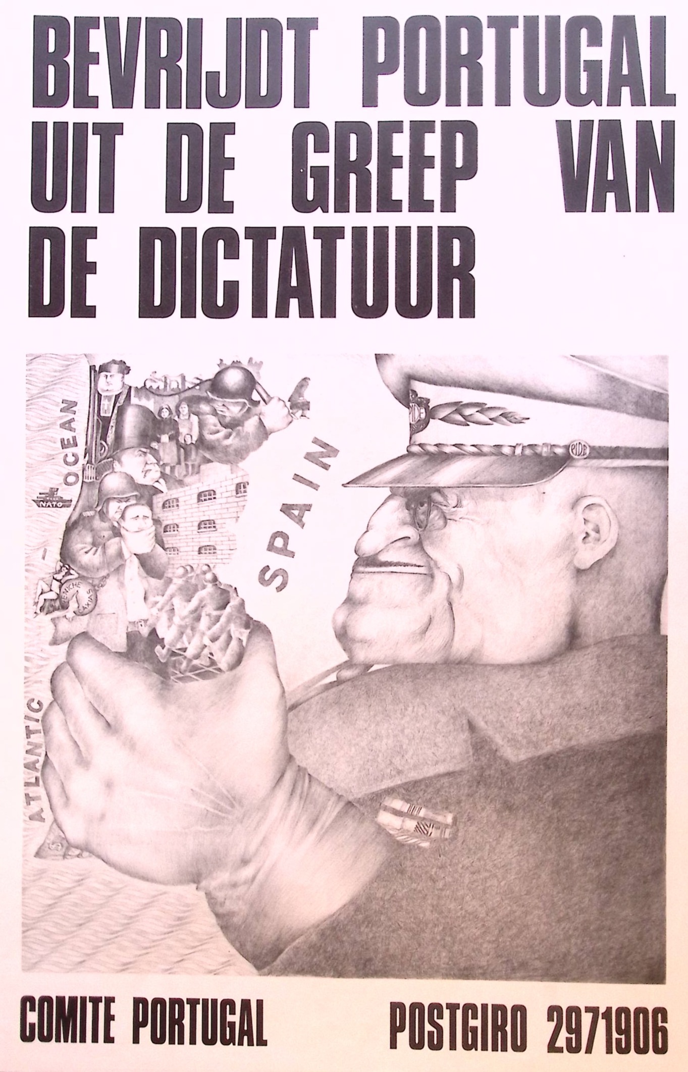BEVRIJDT PORTUGAL UIT DE GREEP VAN DE DICTATUUR SPAIN COMITE PORTUGAL POSTGIRO 2971906. De prent heeft een afmeting van ca. 38 bij 59 centimeter.