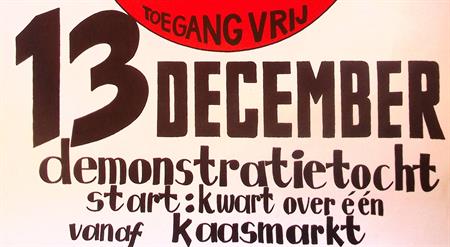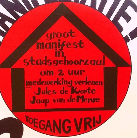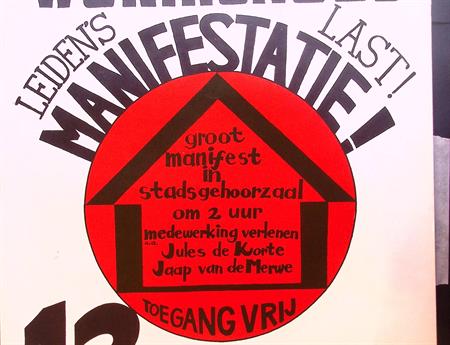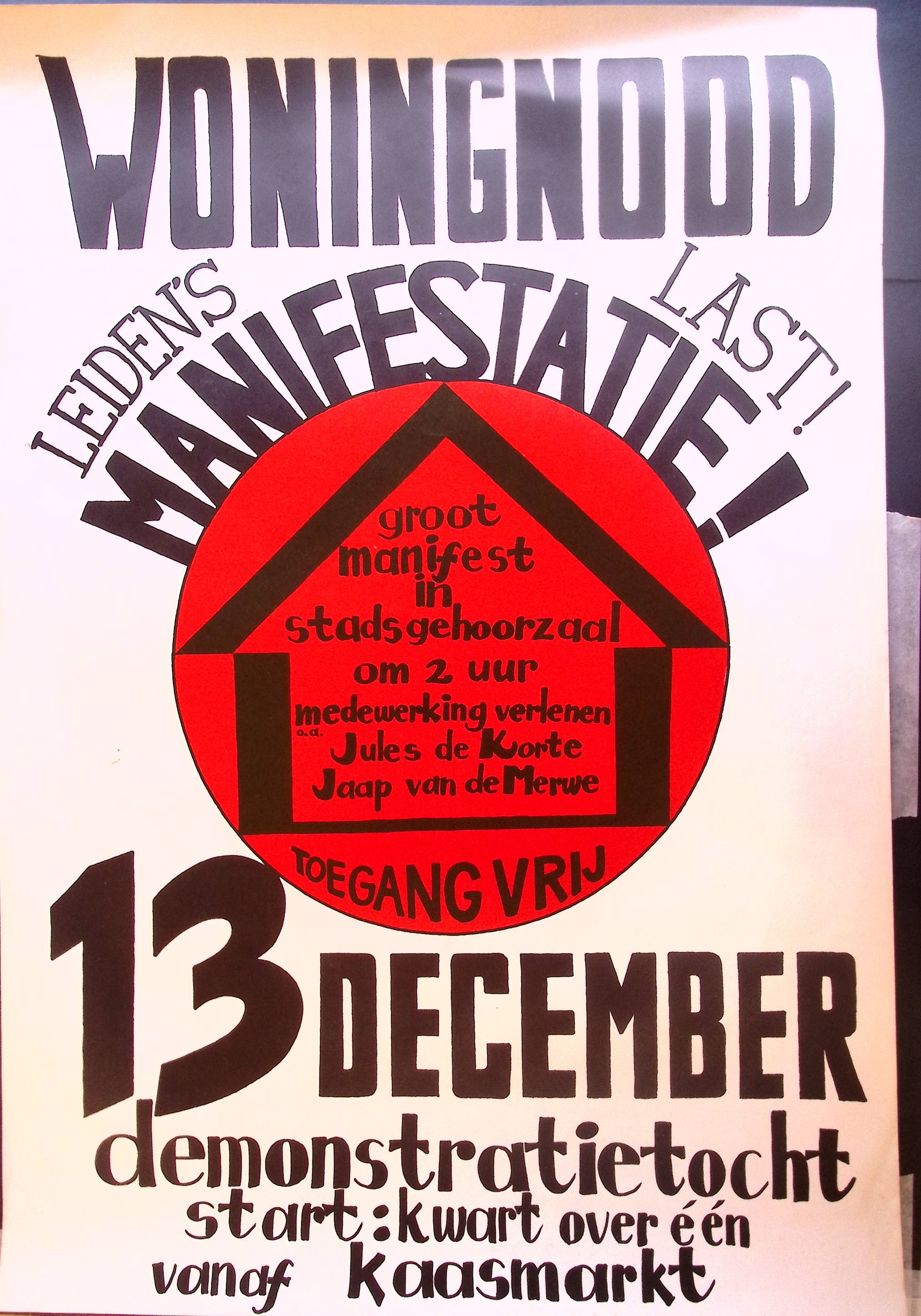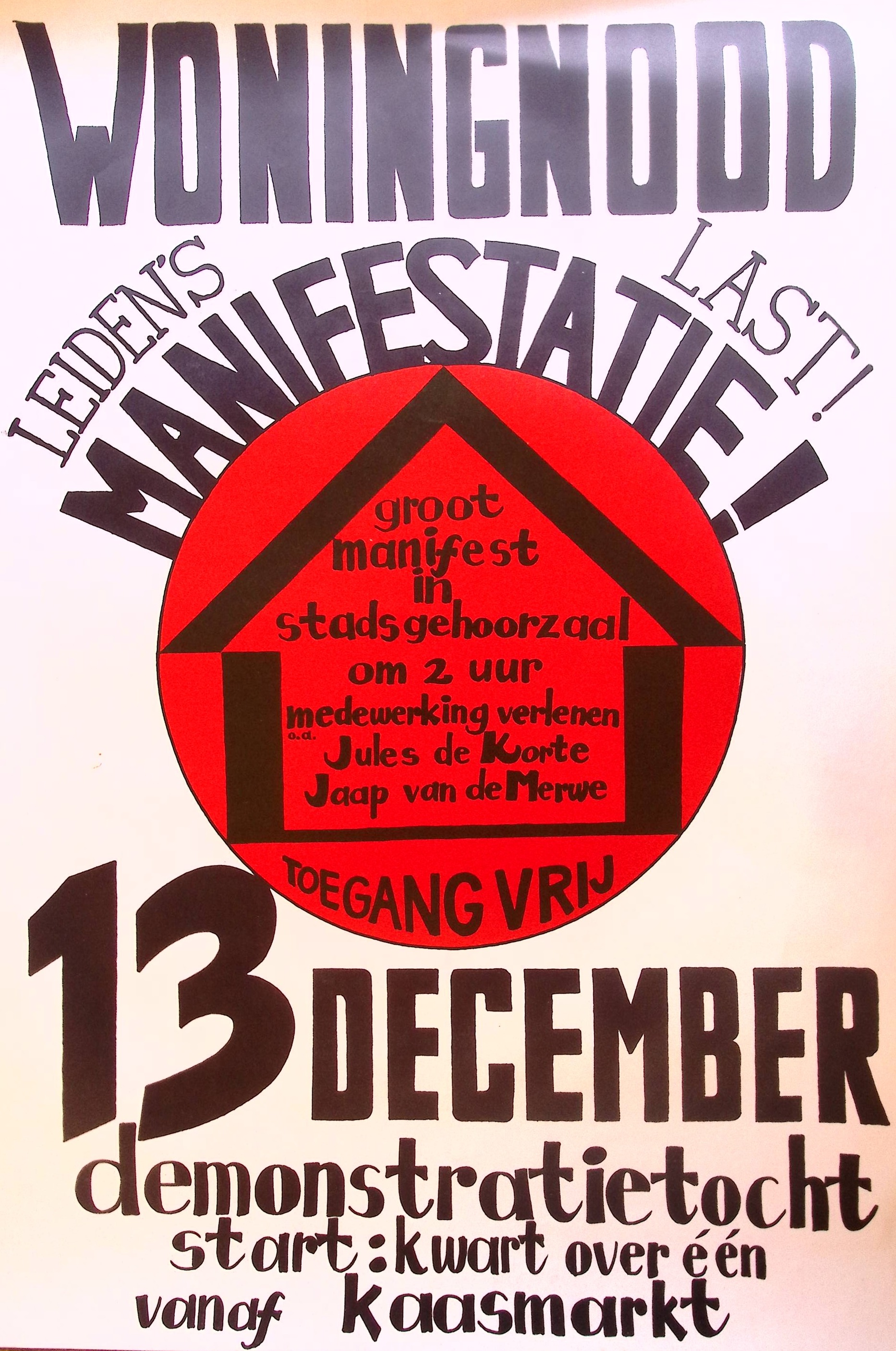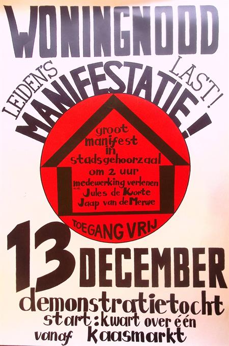 WONINGNOOD LEIDENS LAST! MANIFESTATIE groot manifest in. stadsgehoorzaal om 2 uur medewerking verlenen Jules de Korte Jaap van de Merwe TOEGANG VRIJ 13 DECEMBER demonstratietocht start:kwart over één vanaf kaasmarkt. De prent heeft een afmeting van ca. 56 bij 80 centimeter.