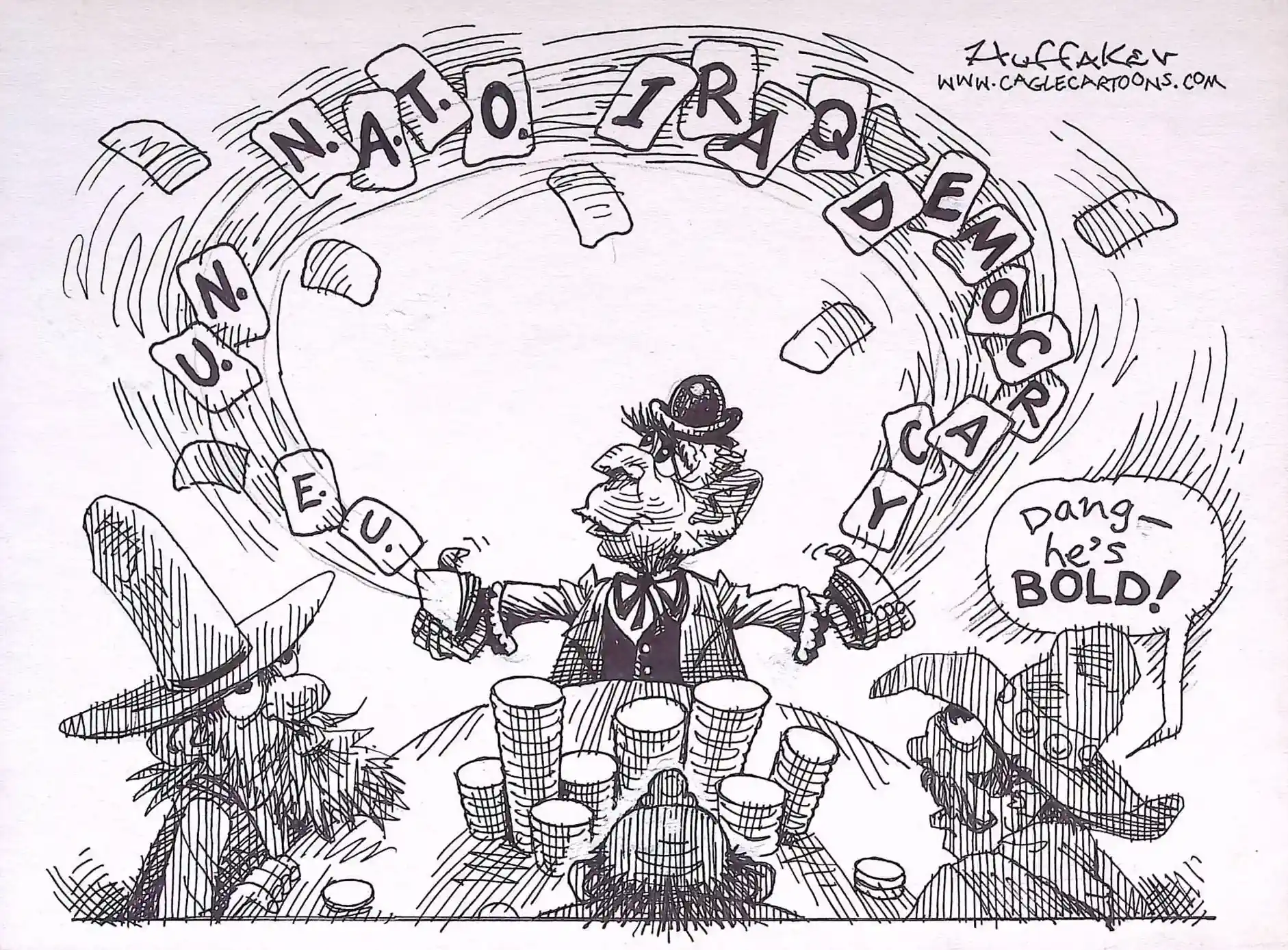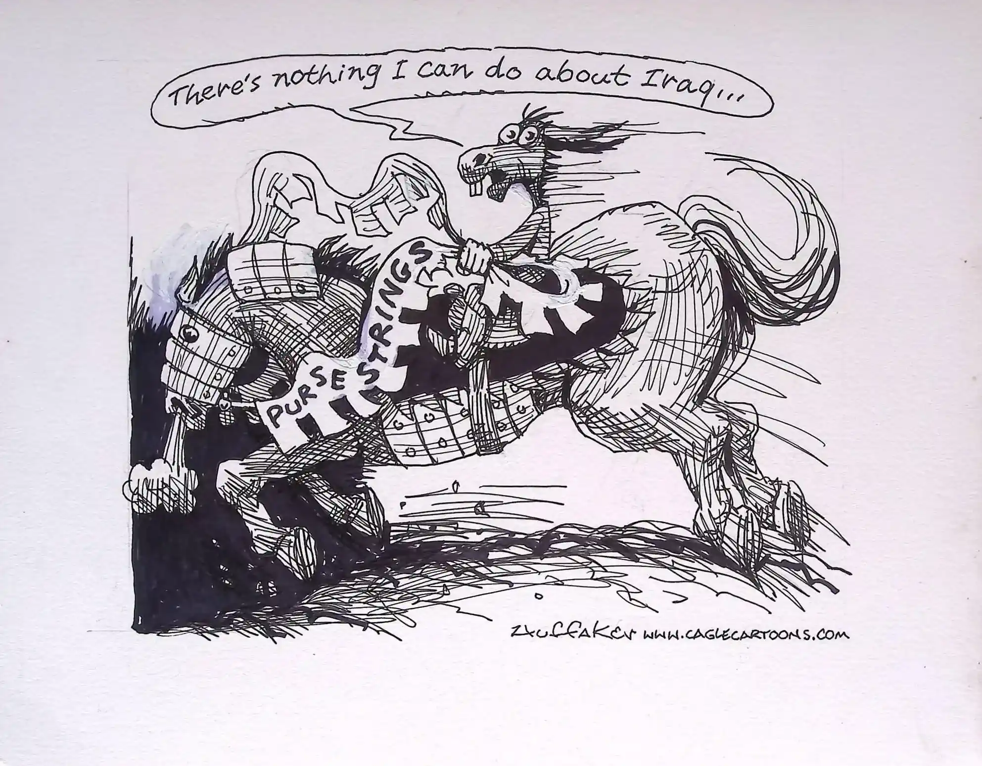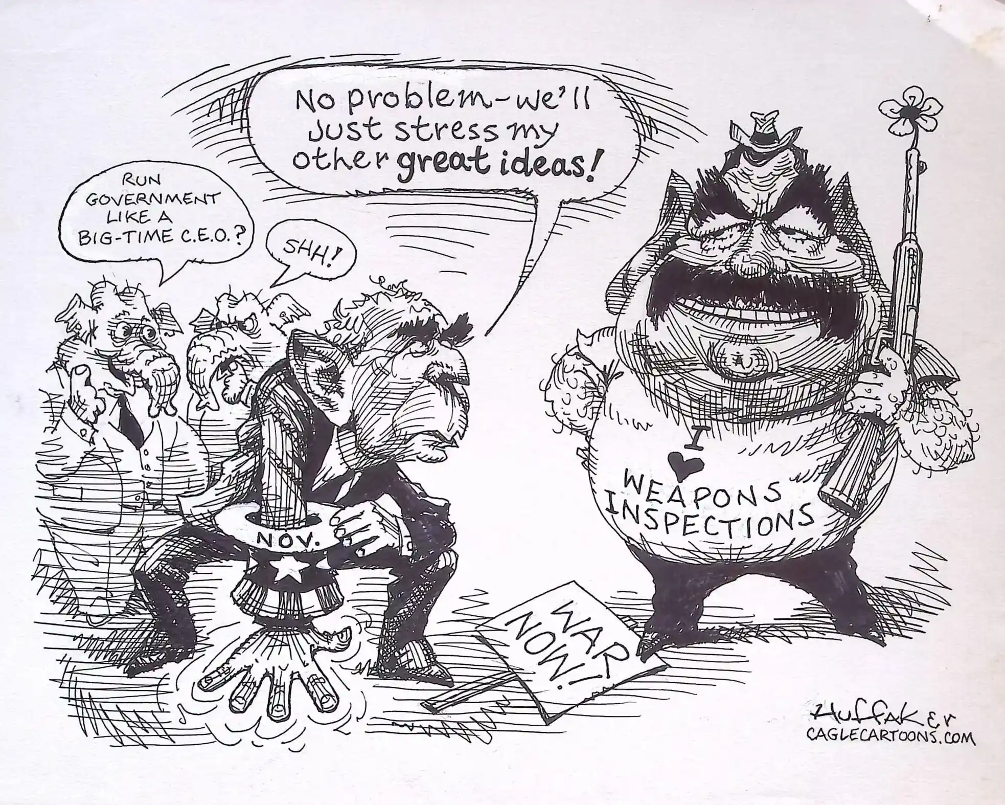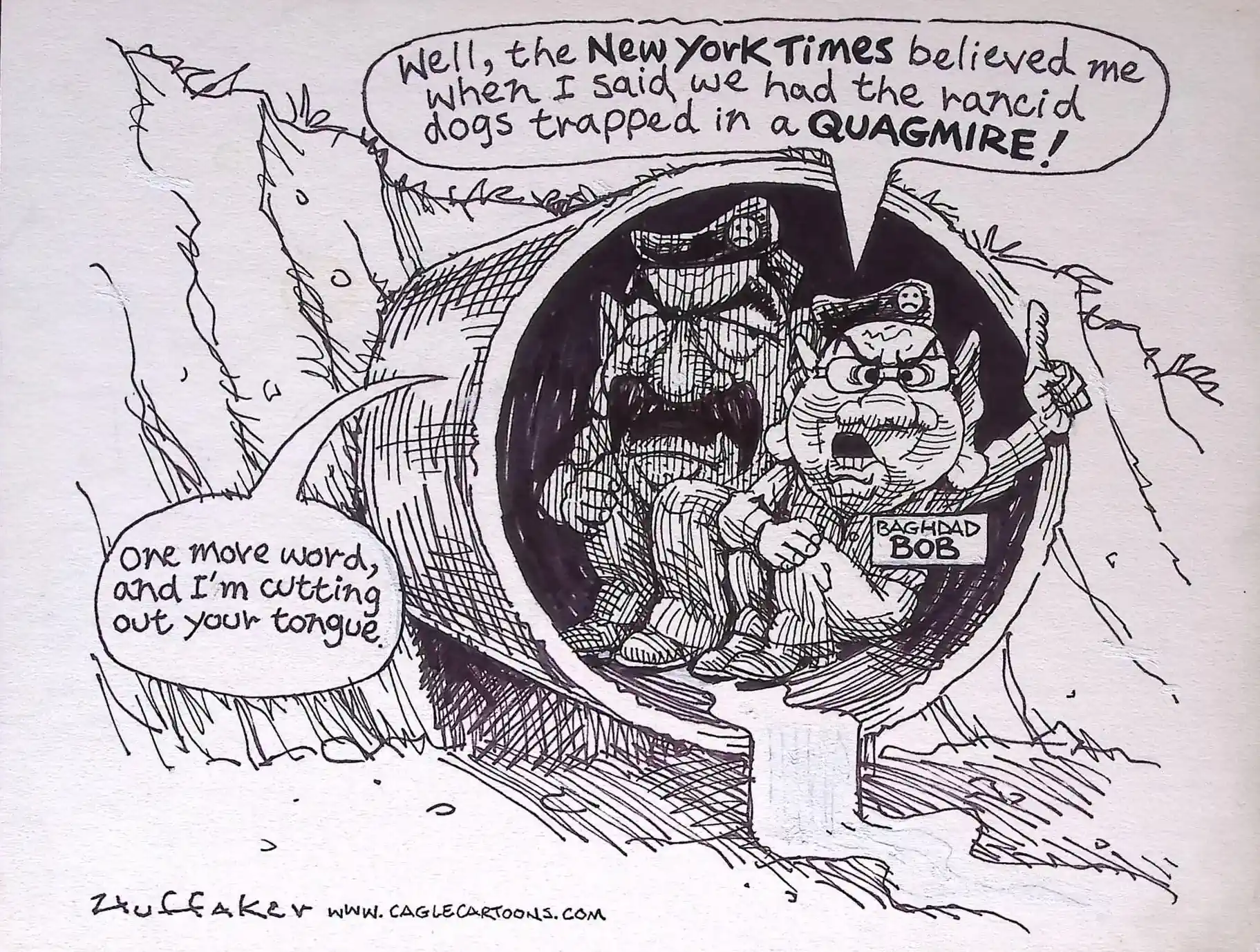 In 1979 nam Saddam de macht volledig over door president Ahmed Hassan al-Bakr te dwingen af te treden. Hij begon meteen met het consolideren van zijn macht door potentiële rivalen uit te schakelen en een uitgebreid netwerk van geheime diensten en loyalisten op te bouwen. Zijn wrede onderdrukking van politieke tegenstanders, inclusief massale executies, vestigde zijn reputatie als een meedogenloze dictator. Spotprenten uit deze periode toonden vaak zijn brutaliteit en de angst die hij onder zijn eigen bevolking zaaide.